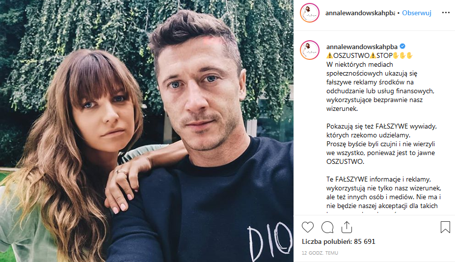Anna i Robert Lewandowscy przestrzegli fanów przed fałszywymi reklamami, które pojawiają się w mediach społecznościowych. Na instagramowym profilu Anny Lewandowskiej para zamieściła oświadczenie, w którym tłumaczy, że nie współpracuje z firmami sprzedającymi środki odchudzające oraz oferującymi usługi finansowe.