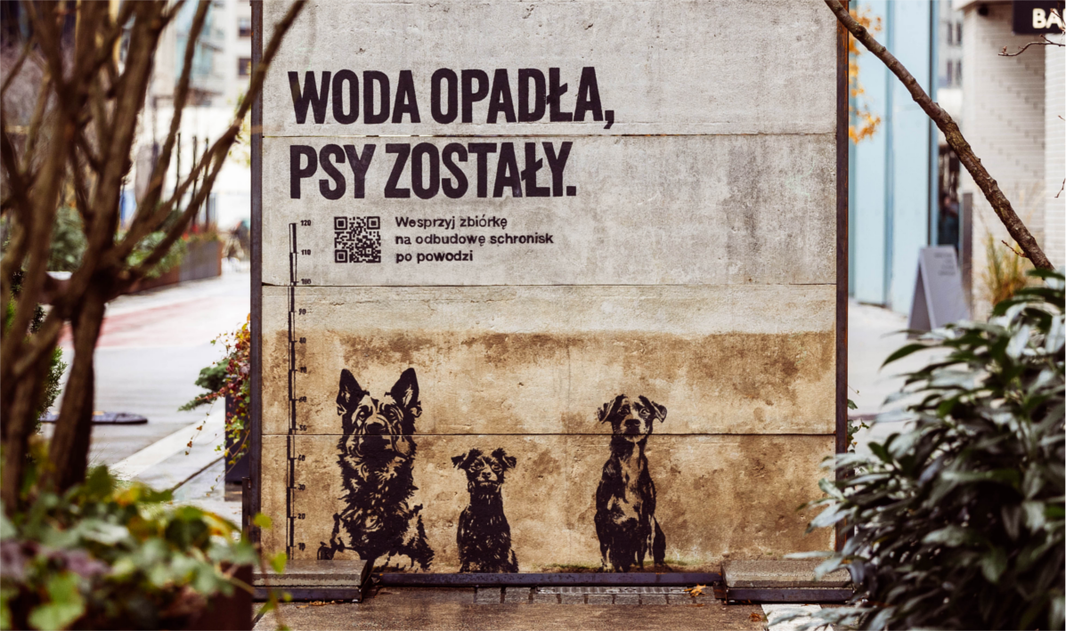 Grupa Publicis postanowiła pomóc schroniskom w powrocie do normalnego funkcjonowania. W ramach kampanii „Woda opadła, psy zostały” mury z zalanych azylów dla bezdomnych zwierząt zostaną umieszczone w trzech dużych miastach w Polsce. W pierwszej kolejności instalacja znajdzie się w Warszawie na terenie Browarów Warszawskich. Linia wody odwzorowana przez grafików ukazuje, do jakiego poziomu dotarła powódź. Umieszczone na murze i odpowiednio przeskalowane podobizny prawdziwych psów mieszkających w zalanych schroniskach obrazują, jak niebezpieczna była to dla nich sytuacja, grożąca bezpośrednio utonięciem.