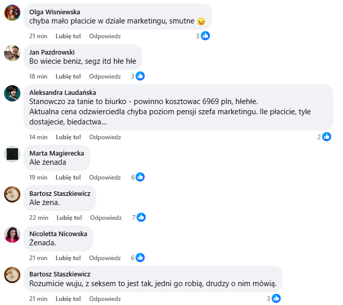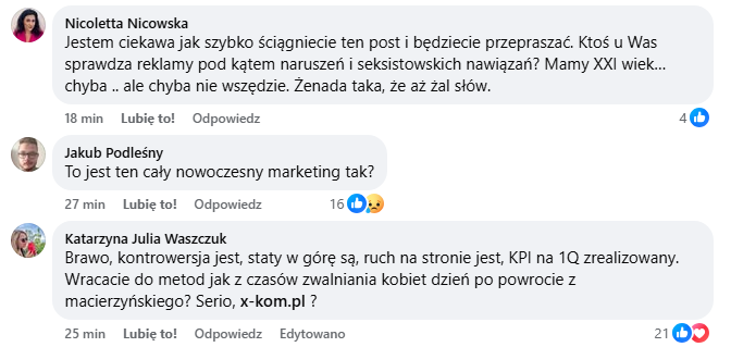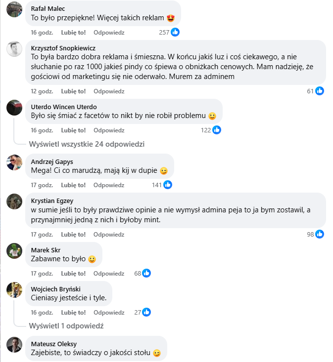Post również wzbudził szerokie zainteresowanie i wywołał dyskusję wśród internautów. Część z nich podtrzymywała oburzenie i narrację spod kontrowersyjnej reklamy. Pod wpisem z przeprosinami zaczęły się jednak pojawiać także komentarze doceniające „innowacyjność” i „odwagę” marki. „Uwielbiam odważny marketing. Działa lepiej niż typowy nudny na maxa i wszystko pisane na jedno kopyto. Naprawdę smutni ludzie musieli mieć obiekcje co do tego posta” – czytamy w jednym z komentarzy na Facebooku.