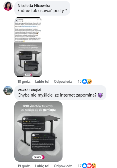 Sam wpis dotyczący biurka gamingowego nie wzbudzał zastrzeżeń – zawierał on opis produktu z wyliczeniem jego zalet. Kontrowersje wzbudziła natomiast przygotowana grafika, na której zamieszczono dwie opinie konsumentów. Wystawione „recenzje” wprost sugerowały, że wspomniane biurko sprawdza się także w innym celu niż zakładał producent – niekoniecznie związanym z pracą czy gamingiem.