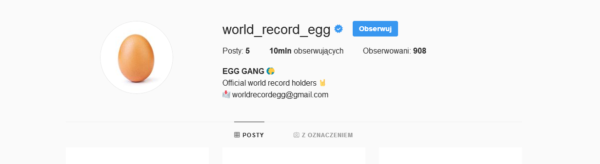 Na początku stycznia 2019 roku na Instagramie pojawiło się konto world_record_egg. Opublikowano na nim zdjęcie przedstawiające jajko. Post szybko zdobył popularność, detronizując najpopularniejszy dotąd wpis na platformie, należący do Kylie Jenner – do tej pory zdjęcie jajka polubiło ponad 52 mln osób – opisuje mashable.com.