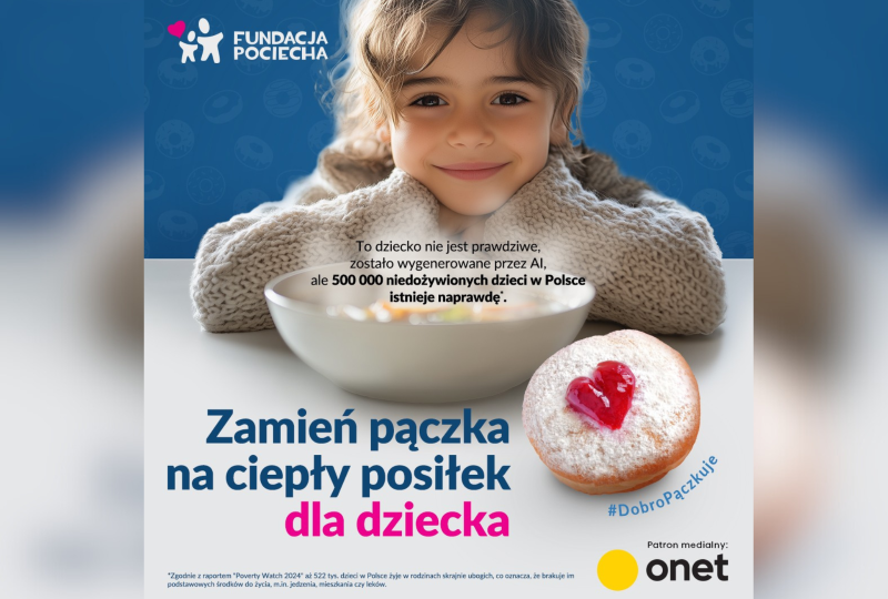 „Tłusty czwartek to czas słodkich przyjemności. Ale co, jeśli jeden pączek mógłby zmienić czyjeś życie?” – takie pytanie stawiają organizatorzy akcji, którzy starają zwrócić uwagę społeczeństwa na problem niedożywienia dzieci w Polsce. Choć o problemie głodu w Polsce rzadko się mówi, wciąż pozostaje on istotnym wyzwaniem społecznym. Fundacja Pociecha stara się zwrócić uwagę na skalę tego zjawiska. Okazuje się, że w 2024 roku nawet 522 tys. dzieci w Polsce żyło w skrajnym ubóstwie – stanowi to wzrost o 125 tys. w porównaniu z rokiem poprzednim*. „Dzieci wychowujące się w takich warunkach są szczególnie narażone na głód, niedożywienie czy brak dostępu do pełnowartościowych posiłków” – podkreślają organizatorzy akcji.