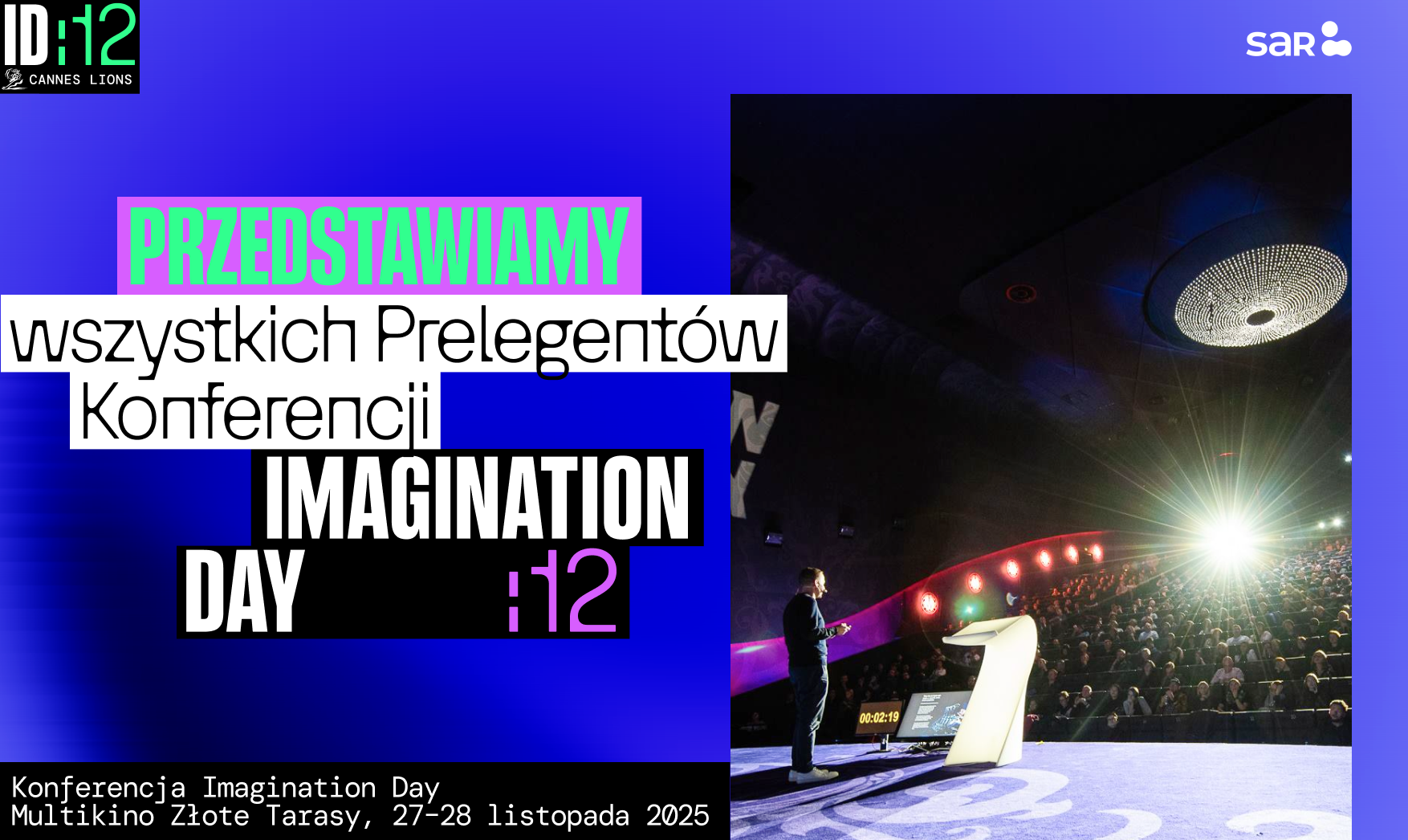 Imagination Day 2025 odbędzie się w dniach 27–28 listopada w Multikinie Złote Tarasy w Warszawie. Organizatorem konferencji jest Stowarzyszenie Komunikacji Marketingowej SAR – oficjalny przedstawiciel Cannes Lions w Polsce.
