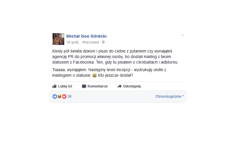 „Nie, nie wiedziałem o tej wysyłce, napisałem ironicznie o wynajęciu agencji (we wpisie na Facebooku – przyp.red.; screen niżej), ale oczywiście żadnej agencji do promocji własnej osoby nie zatrudniałem. Mój status został wykorzystany na prawach cytatu, z oznaczeniem źródła, więc nie mogę się do tego przyczepić, zresztą nie mam prawdę mówiąc z tym większego problemu. Agencja skontaktowała się zresztą ze mną, gdy pojawiły się pierwsze opinie o tym mailingu w sieci. W sumie mógłbym dostać takie info zaraz po publikacji. Po pierwszych wiadomościach od znajomych nie wiedziałem za bardzo, o co chodzi, ale z drugiej strony to nic dziwnego, że wykorzystuje się cytaty osób publicznych w różnych publikacjach” – powiedział w rozmowie z PRoto.pl Górecki.