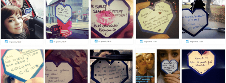 Nie zatrzymaliśmy się na słowach. Zintegrowana akcja zbudowana została wokół małego narzędzia wpływu na kierowców. Wyprodukowaliśmy ponad cztery miliony niebieskich serc, które pasażerowie wieszali pod lusterkami swoich kierowców – by zwracały uwagę pod ich nieobecność. Niektóre zawierały humorystyczne hasła dla kierowców wymyślone przez nas – jak np.: „Sama kredytu nie spłacę. Kocham, jedź ostrożnie”, „W niebie nie ma pierogów. Kocham, jedź ostrożnie” lub po prostu „Chcę się dziś całować. Kocham, jedź ostrożnie”. Ponad milion serc było pustych. Pozwalały pasażerom wpisać własny spersonalizowany tekst wpływający na kierowcę. Serca zalały Polskę. Rozdawaliśmy je w szkołach, na bramkach autostradowych, w oddziałach PZU, przez agentów PZU. I najciekawsze: nawet Policja zamówiła kilkaset tysięcy serc, które wręczała pasażerom i kierowcom podczas rutynowych kontroli.