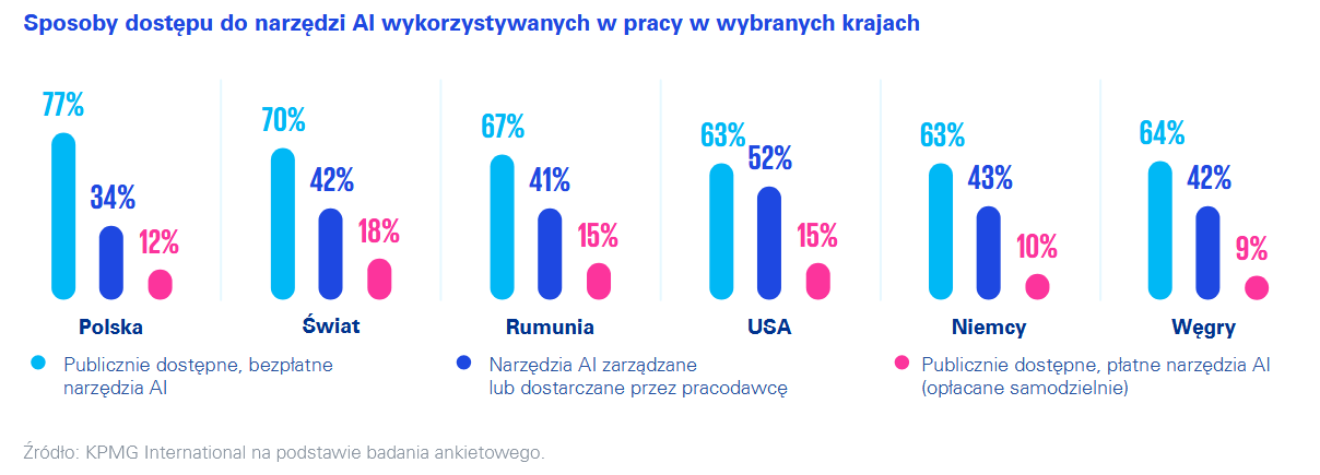 Aż 77 proc. osób korzystających z AI zawodowo sięga po publicznie dostępne, bezpłatne narzędzia, a niemal 90 proc. używa rozwiązań ogólnodostępnych.