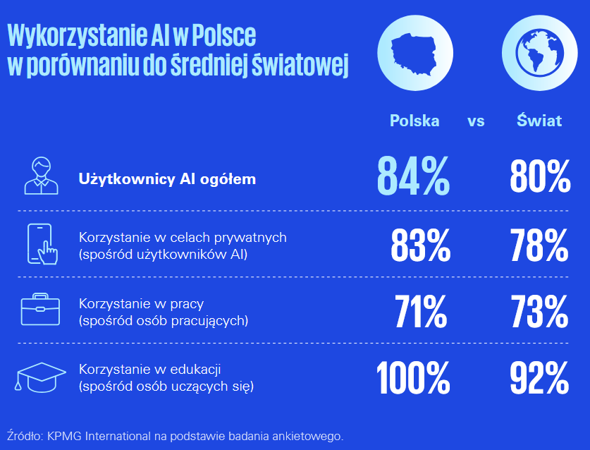 Polska należy do grupy krajów o wysokim poziomie deklarowanego wykorzystania sztucznej inteligencji. Skala wykorzystania tej technologii wyraźnie wyprzedza jednak zarówno poziom wiedzy na temat jej działania, jak i świadomość obowiązujących ram prawnych. Raport „Sztuczna inteligencja w Polsce. Krajobraz pełen paradoksów”, przygotowany przez KPMG na podstawie międzynarodowego badania Uniwersytetu Melbourne, pokazuje obraz dynamicznej, lecz wewnętrznie sprzecznej transformacji cyfrowej.