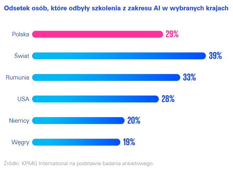 Pomimo szerokiego wykorzystania, jedynie 29 proc. badanych w Polsce uczestniczyło w jakiejkolwiek formie szkolenia z zakresu sztucznej inteligencji – to wynik o 10 punktów procentowych niższy od średniej światowej.
