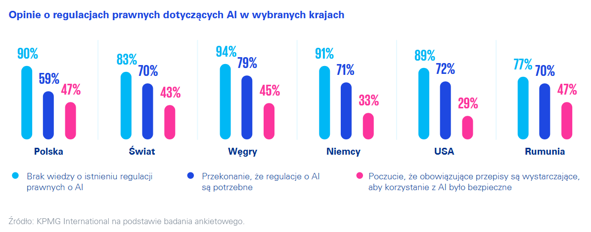 Szczególnie widoczny jest deficyt świadomości regulacyjnej: 90 proc. respondentów nie wie o istnieniu obowiązujących ram prawnych dotyczących AI, w tym europejskiego AI Actu, a jedynie co dziesiąta osoba deklaruje jakąkolwiek wiedzę w tym zakresie.