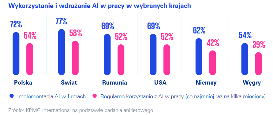 Według deklaracji pracowników, co najmniej 72 proc. organizacji w Polsce wdrożyło rozwiązania oparte na AI, przy czym 40 proc. zrobiło to w ograniczonym zakresie. Regularne i intencjonalne wykorzystanie AI w pracy deklaruje 54 proc. zatrudnionych Polaków. Jednocześnie powszechnym zjawiskiem pozostaje tzw. „shadow AI”, czyli korzystanie przez pracowników z narzędzi sztucznej inteligencji poza wiedzą i kontrolą pracodawcy.