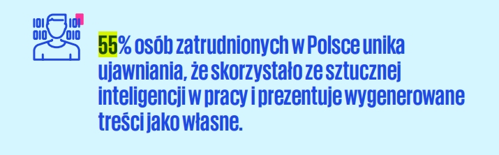 Brak jasnych polityk wewnętrznych sprzyja nieformalnemu wykorzystaniu technologii – 55 proc. pracowników przyznaje, że nie ujawnia faktu korzystania z AI, prezentując wygenerowane treści jako własne. Co czwarty respondent nie wie, czy w jego organizacji istnieją jakiekolwiek wytyczne regulujące użycie sztucznej inteligencji.