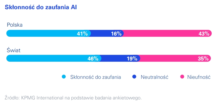 Zaufanie do systemów AI rozwija się wolniej niż skala wykorzystania tej technologii. Jedynie 41 proc. respondentów w Polsce deklaruje zaufanie do sztucznej inteligencji (średnia światowa: 46 proc.). Najwyższy poziom akceptacji dotyczy zastosowań w ochronie zdrowia i medycynie (52 proc.), co wpisuje się w trend obserwowany globalnie.