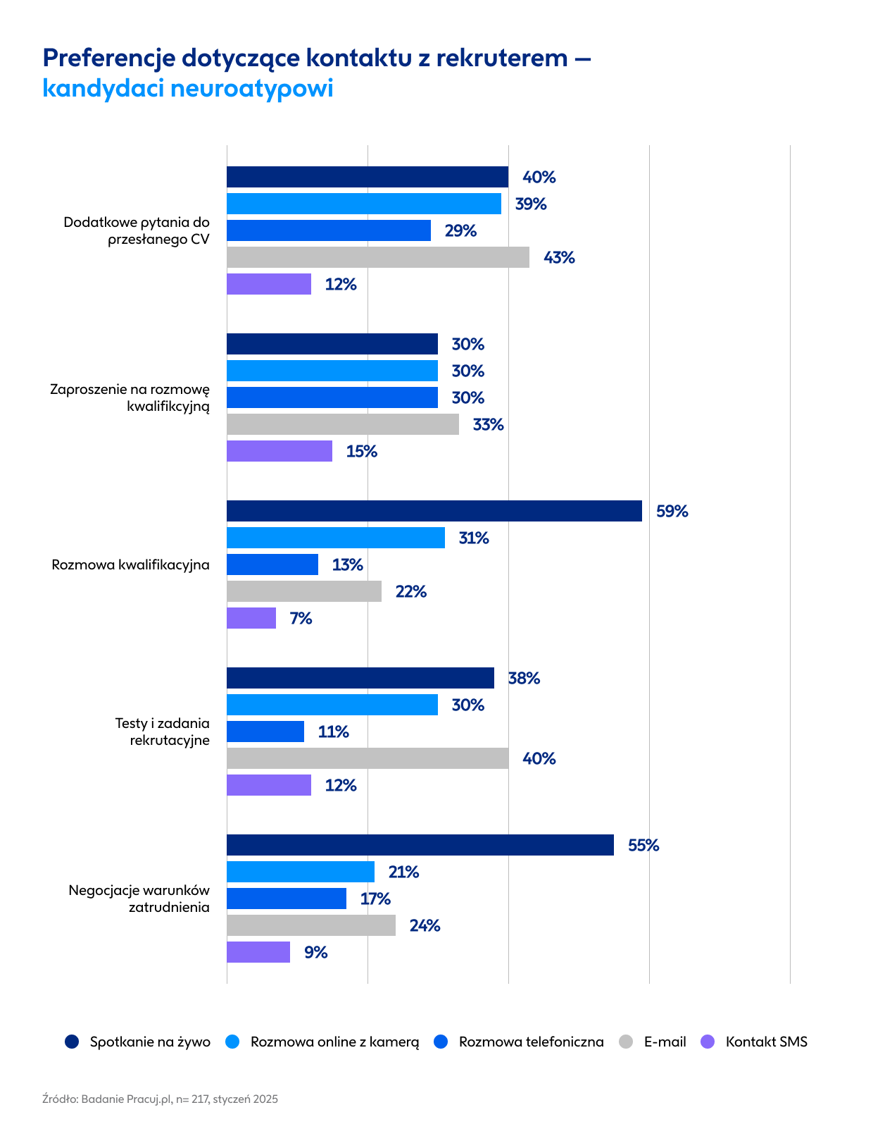W raporcie przyjrzano się również kwestii preferowanych form kontaktu i oczekiwań wobec komunikacji w procesie rekrutacyjnym. Dla osób neuroatypowych to styl i tempo komunikacji często decydują o tym, czy doświadczenie rekrutacyjne będzie wspierające, czy przeciwnie – stresujące i wykluczające. Aż 43 proc. badanych neuroatypowych kandydatów preferuje kontakt mailowy na wczesnym etapie rekrutacji. Kolejne 33 proc. preferuje tę formę także do umawiania spotkań. W przypadku rozmów kwalifikacyjnych i negocjacji warunków zatrudnienia ponad połowa neuroatypowych respondentów woli spotkanie na żywo.