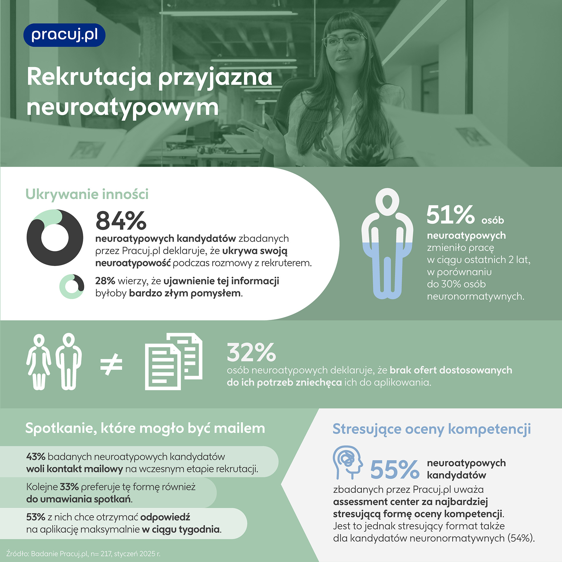Jak podkreśla Pracuj.pl, rekrutacja bywa wyzwaniem nawet dla osób, które doskonale odnajdują się w dynamicznych i pełnych bodźców środowiskach. Dla neuroatypowych kandydatów doświadczenie to jest jeszcze trudniejsze. Okazuje się bowiem, że stresujący jest już sam fakt ujawnienia swojej neuroatypowości podczas rozmowy rekrutacyjnej. Aż 84 proc. osób deklaruje, że ukrywa tę informację przed rekruterem. 28 proc. respondentów wierzy, że ujawnienie faktu swojej neuroatypowości byłoby bardzo złym pomysłem.