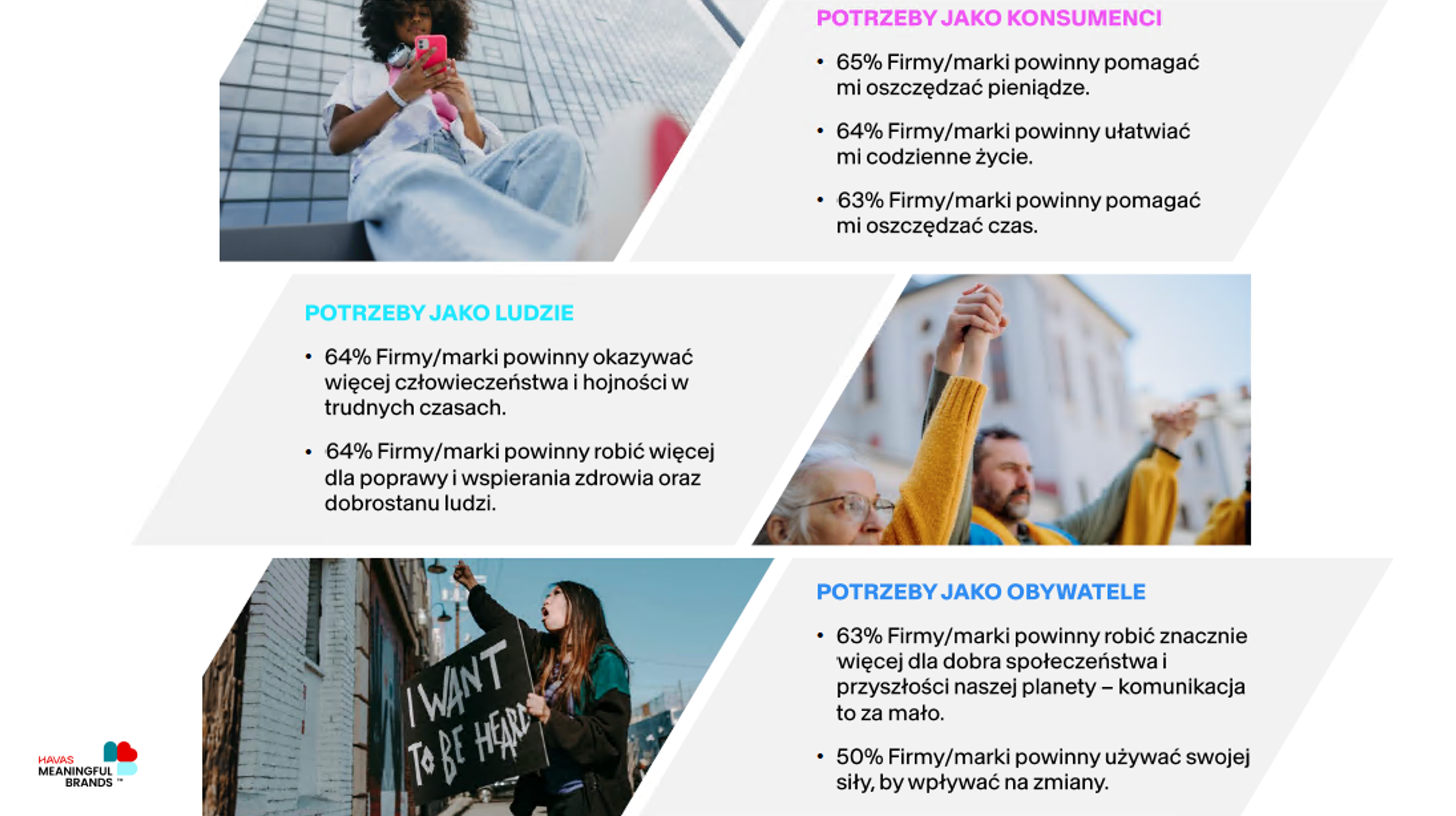 Oczekiwania wobec marek są dziś wielowymiarowe. 65 proc. badanych uważa, że marki powinny pomagać im oszczędzać pieniądze, 64 proc. oczekuje ułatwiania codziennego życia, a 63 proc. liczy na oszczędność czasu. Równolegle 64 proc. respondentów chce większego człowieczeństwa i hojności w trudnych czasach oraz realnego wsparcia zdrowia i dobrostanu.