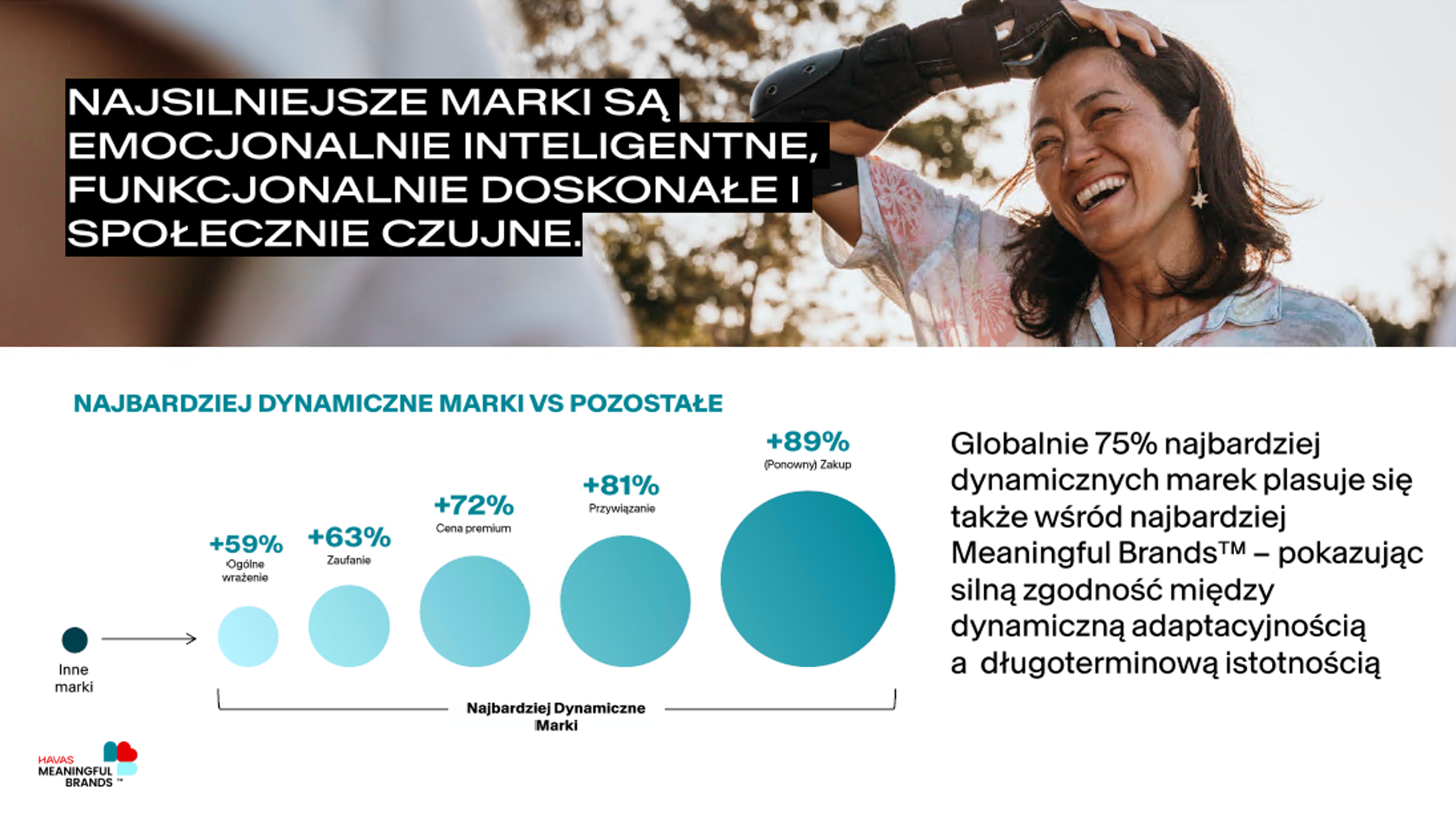 Najbardziej dynamiczne marki stanowią 13 proc. analizowanych podmiotów, czyli 332 z 2594 przebadanych marek. Osiągają o 59 proc. lepsze ogólne wrażenie, o 63 proc. wyższe zaufanie, o 72 proc. większą akceptację ceny premium, o 81 proc. wyższe przywiązanie oraz o 89 proc. wyższy wskaźnik zakupu i ponownego zakupu w porównaniu z pozostałymi. Co istotne, 75 proc. z nich znajduje się również w gronie najbardziej „Meaningful Brands”, co potwierdza silny związek między adaptacyjnością a długoterminową istotnością.