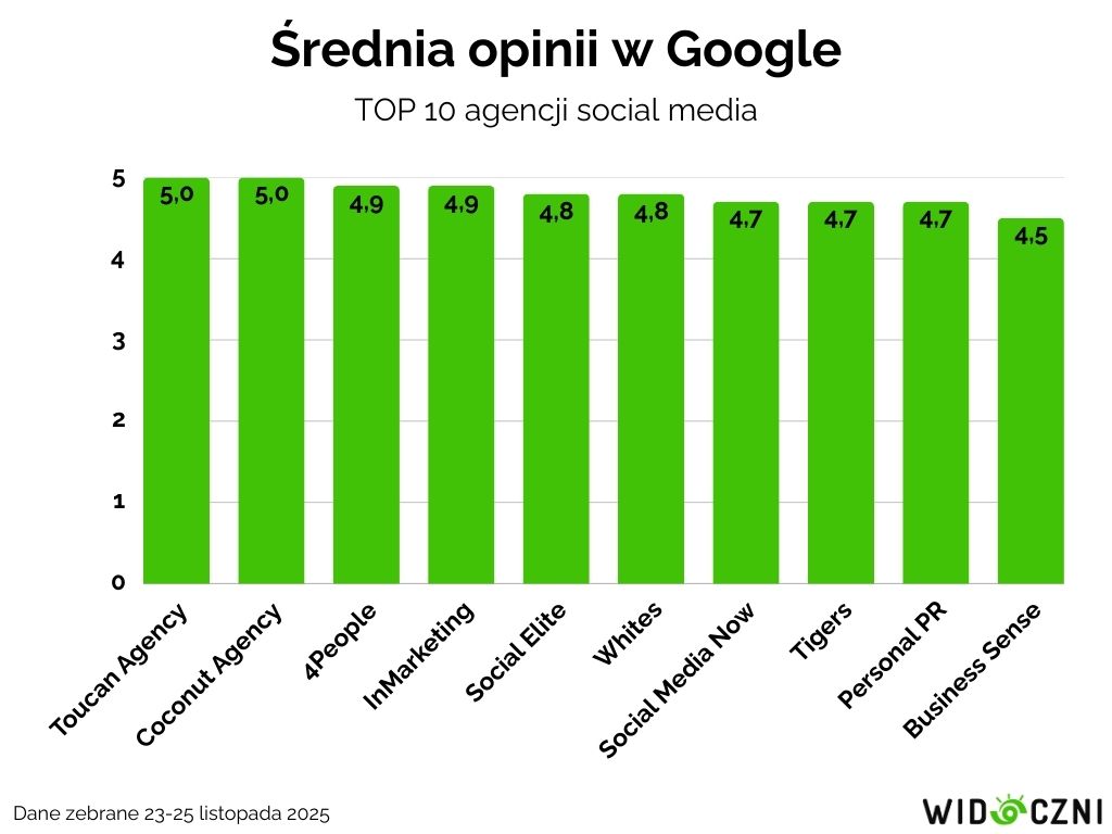 Najwięcej opinii w Google uzyskało Social Elite – 349. Toucan Agency otrzymało 164 opinie, a Coconut Agency – 160. Średnia ocen dla Toucan Agency wynosi 5.0, podobnie jak w przypadku Coconut Agency. 4People oraz InMarketing otrzymały średnią 4.9.