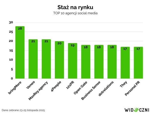 Najdłuższym doświadczeniem w branży może pochwalić się bringMore – agencja działa już od 28 lat. Veneo i MaxRoy.agency istnieją natomiast od 21 lat.