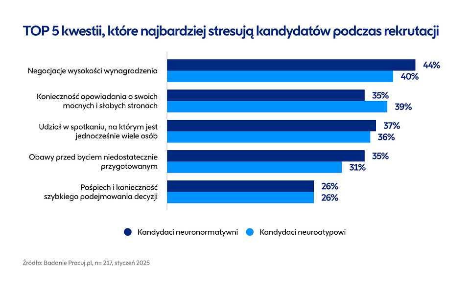 - 44 proc. neuronormatywnych i 40 proc. neuroatypowych kandydatów postrzega negocjowanie pensji jako najbardziej stresujący element rekrutacji;