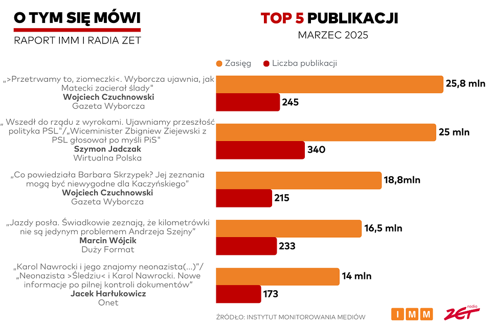 W marcu 2025 roku zestawienie najbardziej zasięgowych publikacji otwiera artykuł Wojciecha Czuchnowskiego z „Gazety Wyborczej” na temat posła Dariusza Mateckiego oraz dowodów zacierania przez niego śladów i utrudniania śledztwa dotyczącego Funduszu Sprawiedliwości. Comiesięczny raport „O tym się mówi” przygotowują Instytut Monitorowania Mediów we współpracy z Radiem ZET. Powstaje on w ramach projektu Nagroda Radia ZET im. Andrzeja Woyciechowskiego.