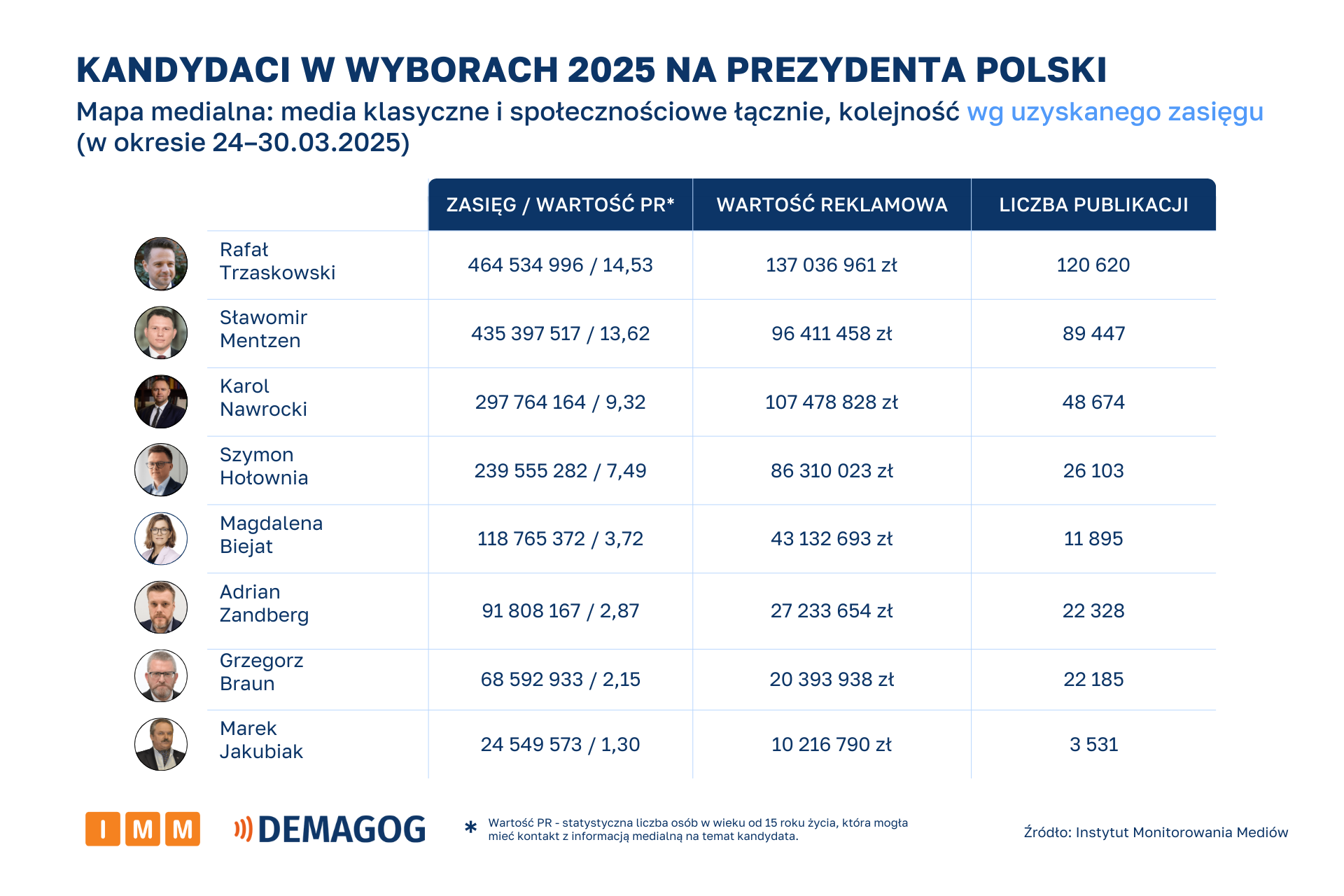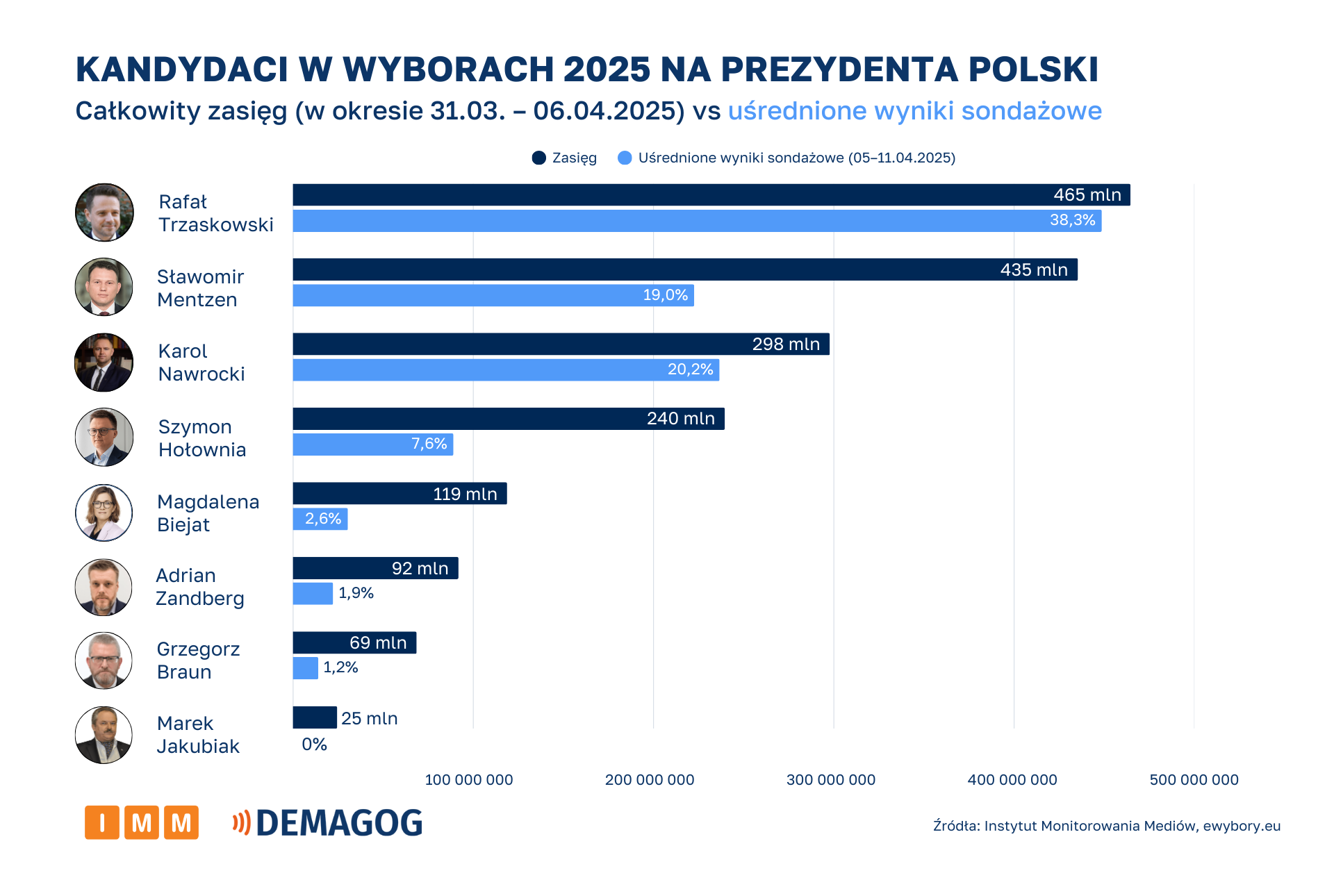 Według danych Instytutu Monitorowania Mediów (IMM) od 31 marca do 6 kwietnia 2025 roku największy zasięg we wszystkich mediach uzyskały informacje dotyczące Rafała Trzaskowskiego – było to prawie 465 mln potencjalnych kontaktów z przekazem. Oznacza to, że statystyczny Polak powyżej 15 roku życia miał kontakt z informacją na temat lidera rankingów sondażowych średnio 14 razy.