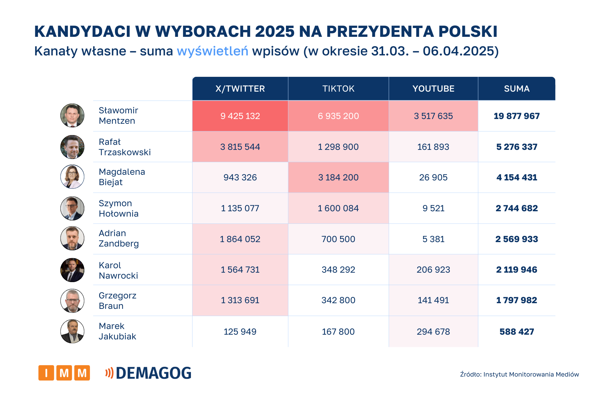 Pod względem zasięgu w mediach społecznościowych Mentzen nie ma sobie równych. Informacje o Rafale Trzaskowskim osiągnęły 168 mln potencjalnych kontaktów z przekazem. Nawrocki i Hołownia mieli pięciokrotnie mniejsze zasięgi w social mediach od Mentzena (nieco powyżej 50 mln kontaktów z przekazem).