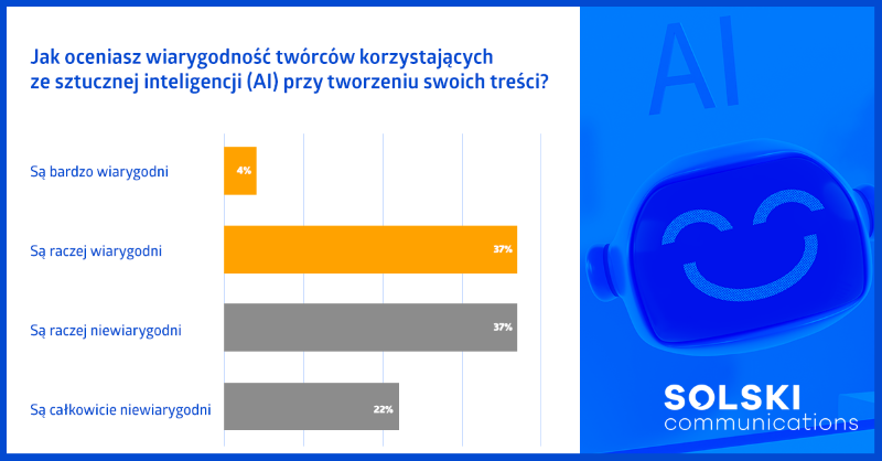 Z raportu wynika, że blisko 60 proc. internautów deklaruje brak zaufania do autorów korzystających z AI. Ponadto nawet co piąty ankietowany (22 proc.) wskazywał na całkowity brak zaufania do treści przygotowywanych w ten sposób, twierdząc, że mogą być one mniej rzetelne i wprowadzać w błąd. 37 proc. respondentów jest zdania, że ci autorzy są „raczej niewiarygodni”, gdyż mogą tworzyć mniej dokładne lub mniej obiektywne treści. Taki sam odsetek (37 proc.) twierdzi, że twórcy wykorzystujący AI są „raczej wiarygodni”, ale ich treści wymagają dodatkowej weryfikacji. Zaledwie 4 proc. respondentów uważa, że twórcy korzystający z narzędzi opartych na sztucznej inteligencji są równie lub bardziej wiarygodni niż autorzy, którzy nie wykorzystują tej technologii w swojej pracy.
