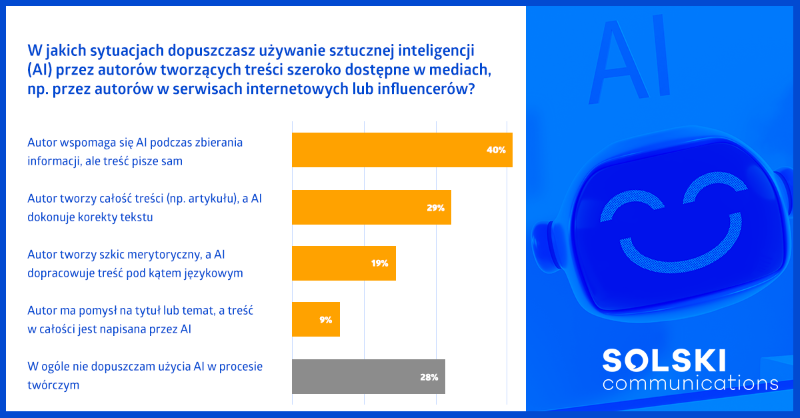 W badaniu zapytano respondentów również o to, w jakich konkretnie sytuacjach dopuszczają korzystanie z narzędzi opartych na sztucznej inteligencji do tworzenia tekstów. Okazuje się, że ankietowani w największym stopniu (40 proc.) dopuszczają sytuację, w której autor wspomaga się AI podczas zbierania informacji, jednak treść tekstu opracowuje już samodzielnie. 29 proc. respondentów przystaje również na to, by za pomocą narzędzi AI dokonywać korekty artykułu przygotowanego wcześniej przez twórcę. Co piąty ankietowany (19 proc.) dopuszcza sytuację, w której autor tworzy szkic merytoryczny tekstu, a sztuczna inteligencja opracowuje jego treść. Najrzadziej respondenci są skłonni zaakceptować sytuację, w której rola autora sprowadza się jedynie do wymyślenia pomysłu na temat lub tytuł artykułu, a sztuczna inteligencja w całości odpowiada za przygotowanie treści – taka forma tworzenia tekstu spotkała się aprobatą jedynie 9 proc. ankietowanych.