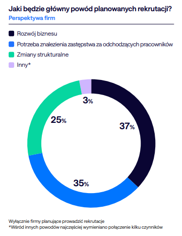 97 proc. firm objętych badaniem prowadziło rekrutacje w pierwszej połowie roku, a 90 proc. planowało je również w drugiej połowie 2025 roku. Jako główne powody zatrudniania nowych pracowników wskazywano rozwój biznesu (37 proc.), konieczność zastąpienia odchodzących pracowników (35 proc.) oraz zmiany strukturalne (25 proc.).