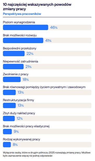 Aż 62 proc. specjalistów i menedżerów rozważała zmianę pracy w drugim półroczu 2025 roku. Wśród najczęściej wskazywanych powodów znalazły się m.in. poziom wynagrodzenia (46 proc.), brak możliwości rozwoju (41 proc.) czy bezpośredni przełożony (22 proc.).