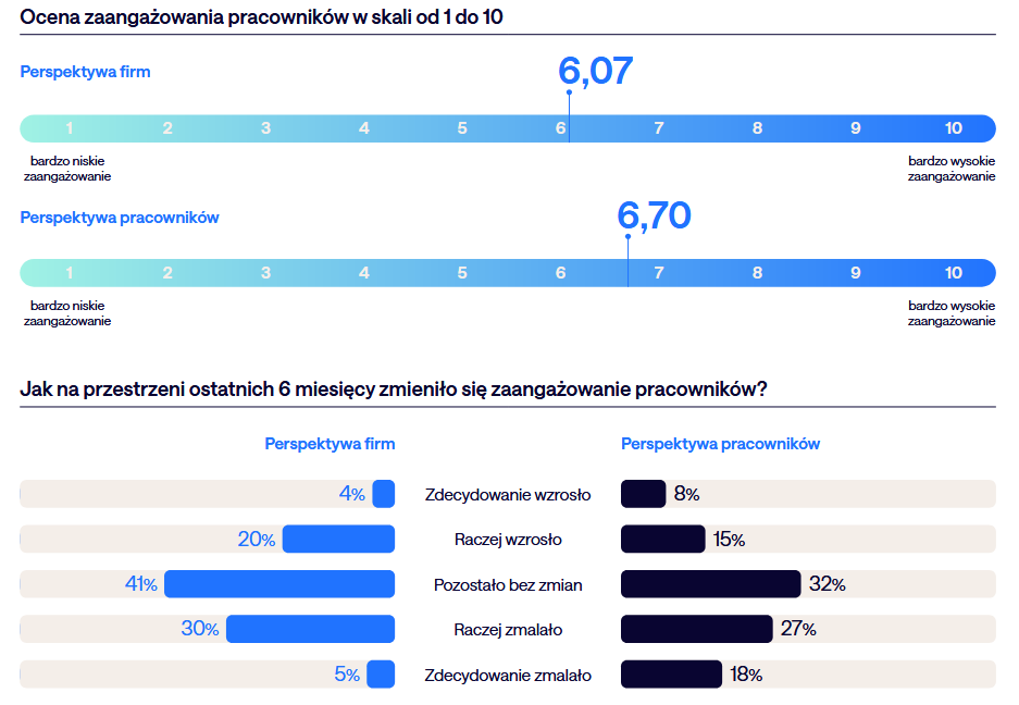 Choć większość pracodawców uważa, że poziom zaangażowania w mijającym roku się nie zmienił, więcej jest jednak tych, którzy zauważyli spadek (35 proc.) niż wzrost (24 proc.). Podobny trend można zaobserwować w odpowiedziach pracowników. Obie grupy oceniają zaangażowanie na umiarkowany, nie do końca satysfakcjonujący poziom. W skali od 1 do 10 firmy przyznały mu 6,07, a pracownicy nieznacznie więcej — 6,70.