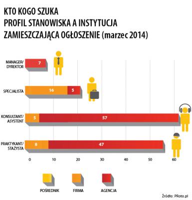 Bardzo duża aktywność agencji przełożyła się na ogólny wzrost liczby ofert. W marcu pojawiło się ich o 33 proc. więcej niż w lutym. Łącznie w całym I kwartale 2014 roku opublikowano 370 ogłoszeń, z czego ogłoszenia agencji stanowiły aż 70 proc. Firmy, po nieznacznym wzroście liczby ofert w lutym, znów nie kwapiły się do zatrudniania nowych PR-owców, o czym świadczy zaledwie 29 ofert opublikowanych w ubiegłym miesiącu.