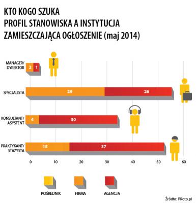 W maju swoją aktywność na rynku pracy zwiększyły firmy, które opublikowały o 27 ofert więcej niż w kwietniu (wzrost o 54 proc.). O 9 ofert mniej opublikowały natomiast agencje (spadek o 9 proc.). Mimo że wzrosło zainteresowanie praktykantami i stażystami, od lutego oferty staży i praktyk ustępują liczebnością albo ogłoszeniom dla specjalistów (w lutym i maju) albo ofertom dla konsultantów i asystentów (w marcu i kwietniu).