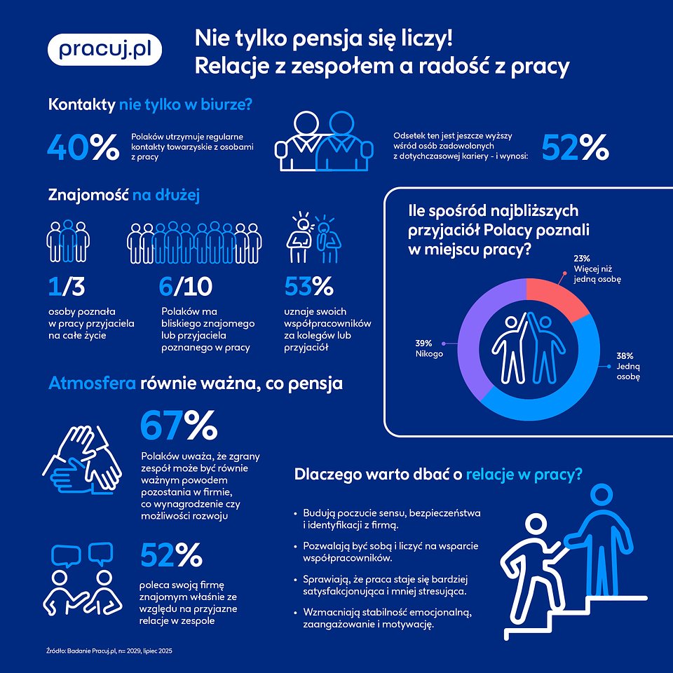 40 proc. Polaków utrzymuje regularne kontakty towarzyskie ze współpracownikami, a 1 na 3 osoby poznała w pracy przyjaciela na całe życie – i to właśnie ci pracownicy częściej deklarują, że są bardzo zadowoleni ze swojej kariery. To jednak nie koniec! 6 na 10 respondentów ma bliskiego znajomego lub przyjaciela właśnie z pracy, a ponad połowa (53 proc.) uznaje swoich współpracowników za kolegów lub przyjaciół.