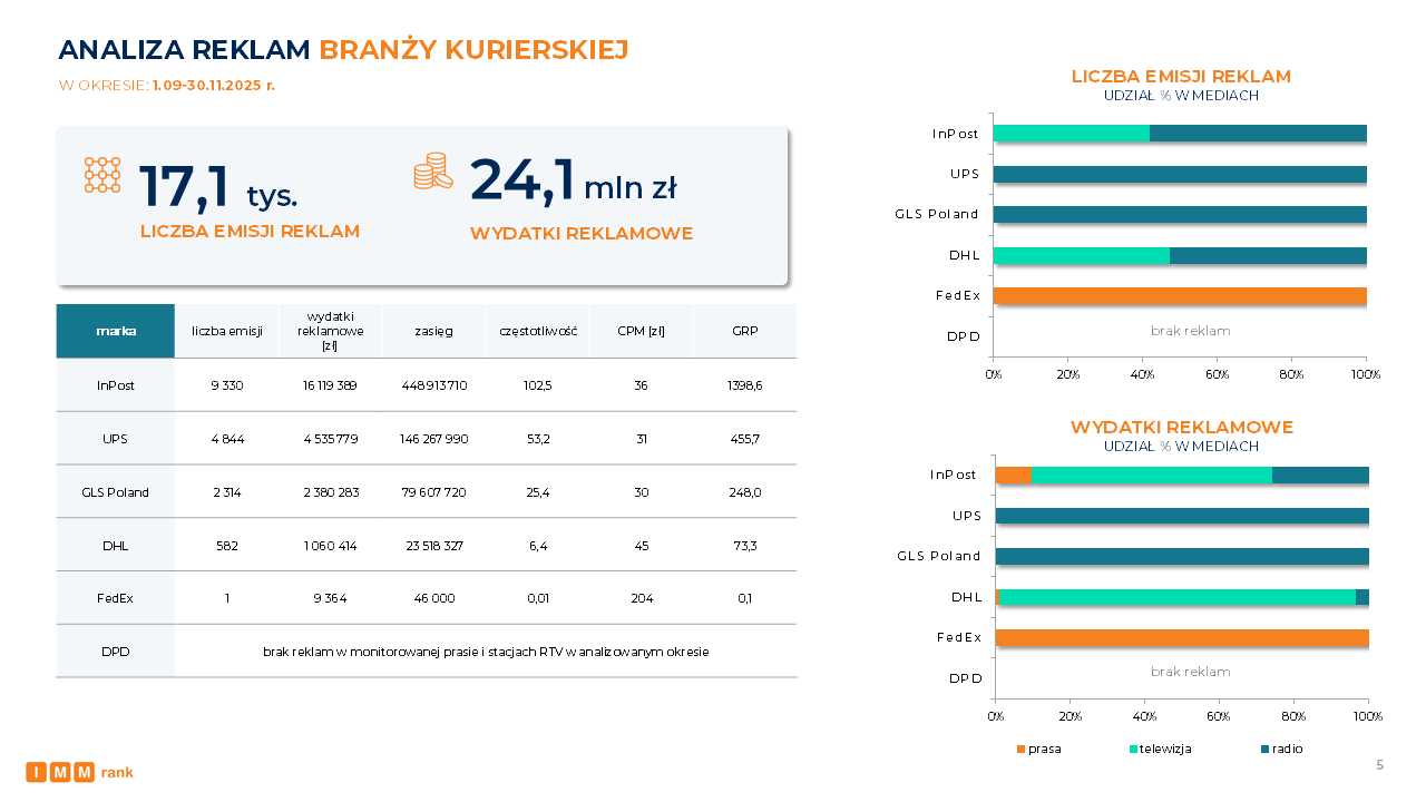 W badanym okresie na reklamę branży kurierskiej w prasie oraz RTV przeznaczono łącznie 24,1 mln zł, z czego przeważająca część (11,4 mln zł) została wydatkowana na spoty w telewizji. O ponad połowę mniej wyniosły łącznie nakłady na reklamę w radiu (11,1 mln zł). Wydatki reklamowe w prasie kształtowały się na poziomie 1,6 mln zł netto według cenników wydawców. W prasie i stacjach RTV wyemitowano łącznie 17,1 tys. reklam, przy czym najwięcej komunikatów można było usłyszeć w radiu (12,9 tys.). Na drugim miejscu uplasowała się telewizja z wynikiem 4,2 tys. emisji, natomiast najniższy wynik w zestawieniu miała prasa – 30 emisji. Warto zauważyć, że choć radio odpowiada za ponad 75 proc. całkowitej liczby emisji, to generuje ono wydatki niemal równe nakładom na telewizję, w której reklam było blisko trzykrotnie mniej.