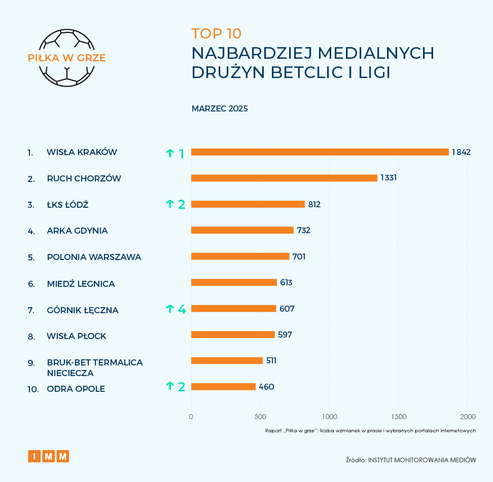 W rankingu medialności drużyn Betclic 1. Ligi z powrotem na pozycji lidera pojawiła się Wisła Kraków. Tuż za nią uplasował się Ruch Chorzów, a podium zamknął ŁKS Łódź. Ostatniego dnia lutego odbyło się wieczorne starcie Arki Gdynia z Wisłą Kraków. Pojedynkowi towarzyszyły liczne opinie, iż jest to jeden z najważniejszych meczów sezonu pod względem końcowego triumfu w rozgrywkach. Zwycięstwo gospodarzy znacznie zwiększyłoby szanse na utrzymanie pozycji lidera Betclic 1. Ligi, zaś wygrana przyjezdnych z Krakowa umocniłaby ich w walce o baraże do PKO BP Ekstraklasy. Zacięty pojedynek skończył się jednakże remisem 2:2, co było popularnym tematem pierwszych dni marca. Wisła następnie odniosła dwa zwycięstwa i jedną porażkę, przez co zajmuje obecnie 6 miejsce, a tuż za nią – podobnie jak w zestawieniu IMM – znajduje się Ruch Chorzów. Drużyna z Górnego Śląska nie wygrała ani jednego meczu w ubiegłym miesiącu, przez co oddaliły się ich szanse na końcowy sukces w lidze. Z kolei jej aktualny lider, Arka Gdynia, zajęła czwarte miejsce w rankingu medialności, a czołową piątkę zamknęła Polonia Warszawa, która imponowała formą w ostatnim miesiącu i opiniuje się, że jest to nowy kandydat do potencjalnego awansu.