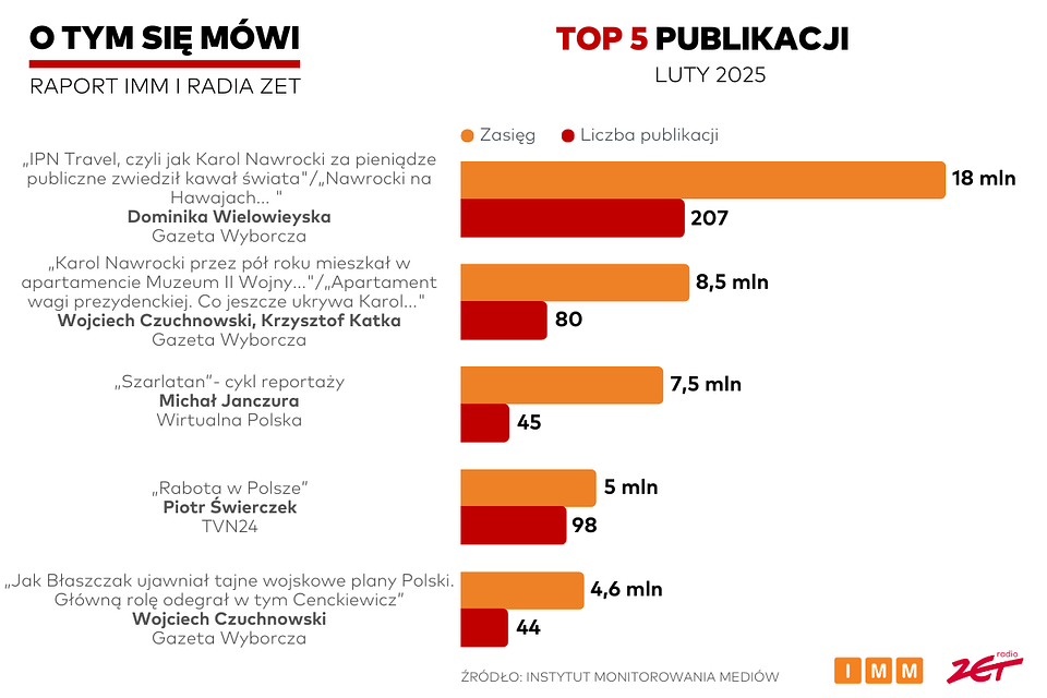 Karol Nawrocki, podobnie jak w styczniu, jest bohaterem najbardziej zasięgowych publikacji. Zestawienie za luty 2025 otwierają dwa artykuły Dominiki Wielowieyskiej: „IPN Travel, czyli jak Karol Nawrocki za pieniądze publiczne zwiedził kawał świata” i „Nawrocki na Hawajach. Kandydat PiS również jako szef Muzeum II Wojny Światowej ostro zwiedzał świat”. Dziennikarka „Gazety Wyborczej” w szczegółach opisuje w nich zagraniczne podróże prezesa IPN, a wcześniej dyrektora Muzeum II Wojny Światowej. Z jej wyliczeń wynika, że kosztowały one podatnika w latach 2017-2024 blisko 800 tys. zł. Na publikacje Wielowieyskiej powoływano się 207 razy, co przełożyło się na zasięg wynoszący 18 mln potencjalnych kontaktów z przekazem.