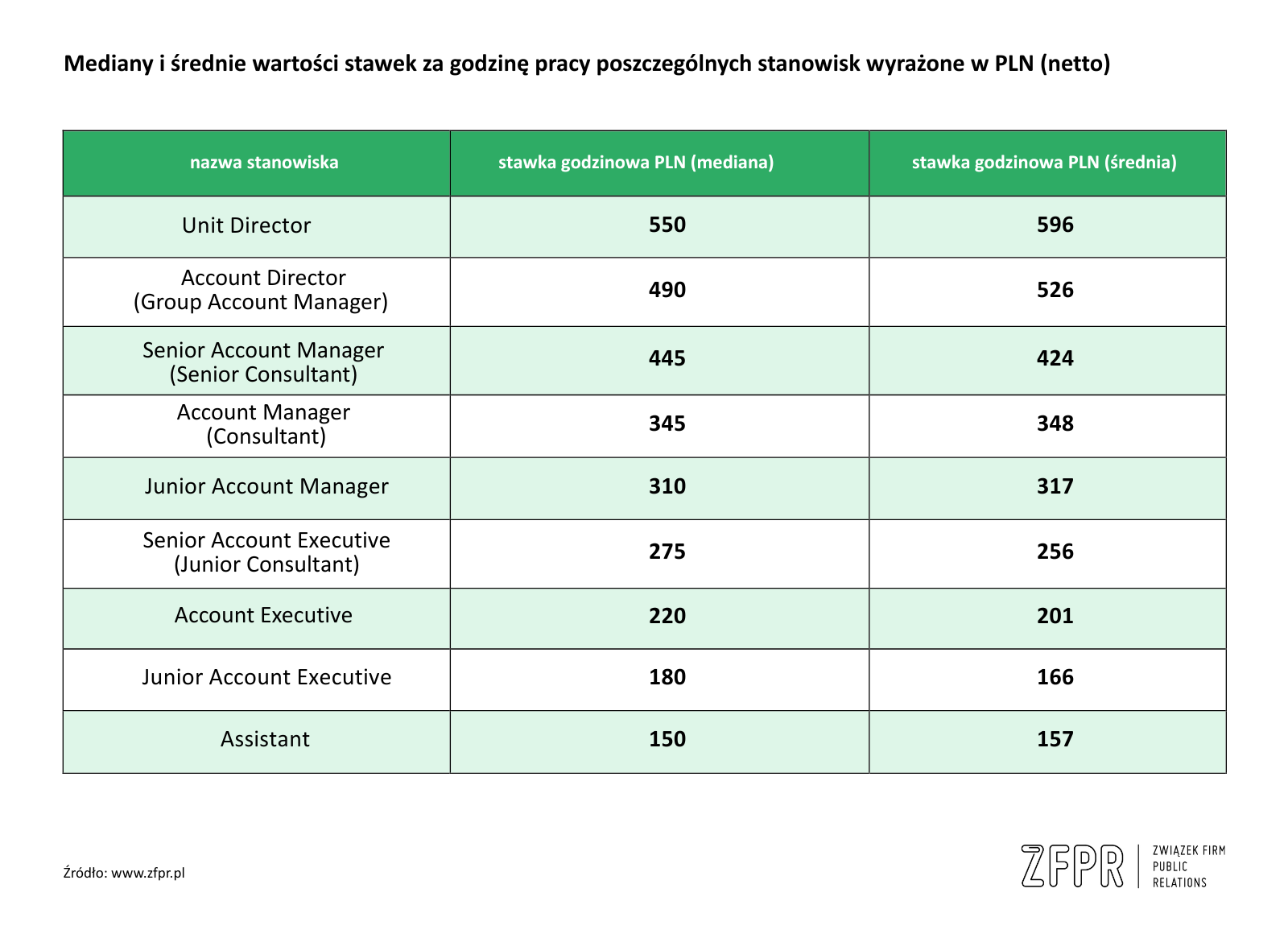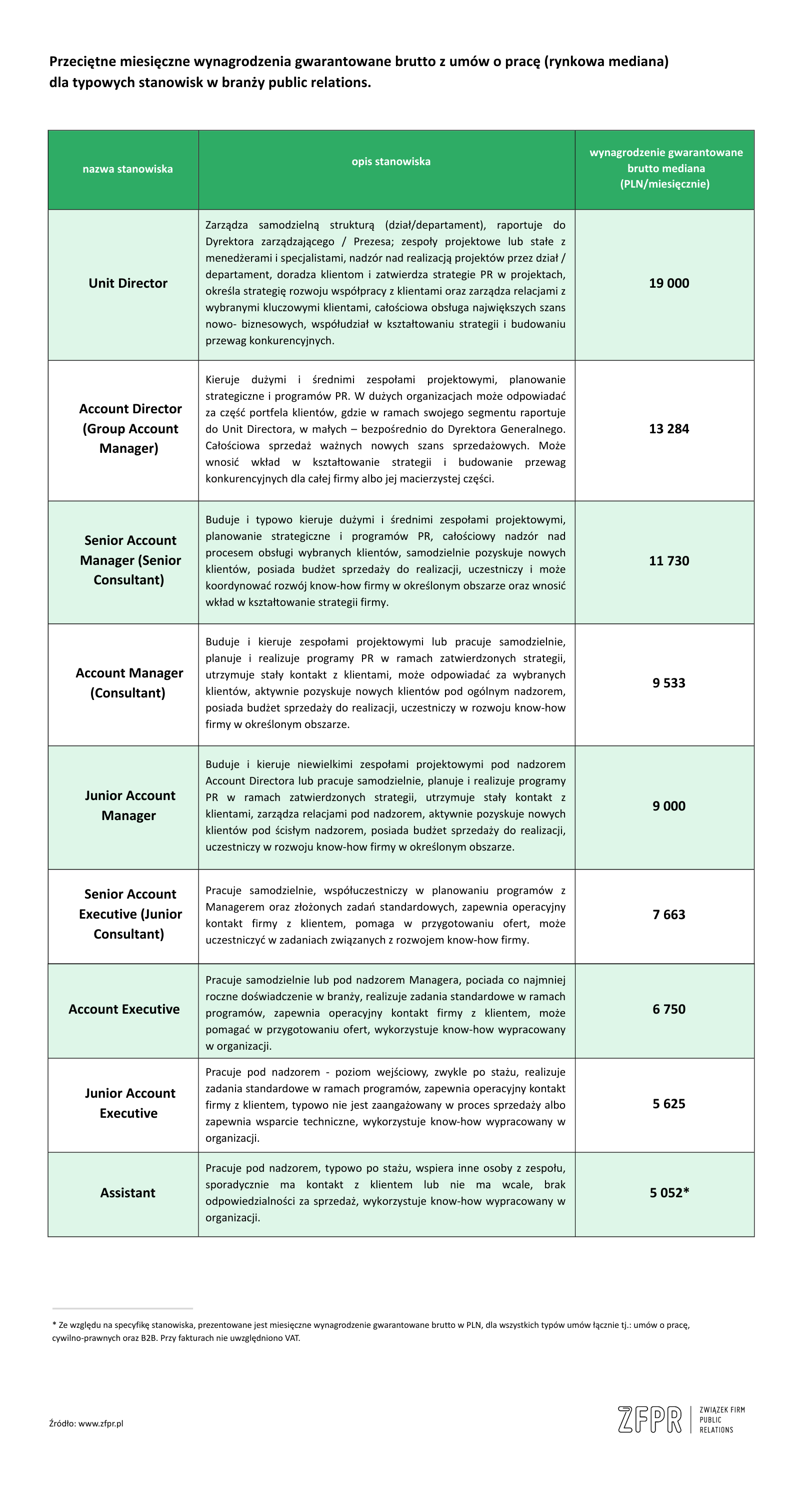 ZFPR prezentuje wartości przeciętnych miesięcznych wynagrodzeń gwarantowanych brutto z umów o pracę (rynkowa mediana) dla typowych stanowisk w branży public relations. Wynagrodzenie gwarantowane nie obejmuje składników zmiennych, takich jak premie, prowizje czy nagrody uznaniowe.