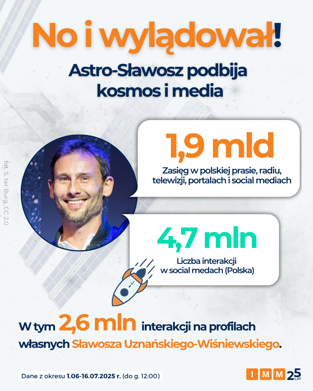 W mediach społecznościowych analitycy IMM odnotowali łącznie 4,7 mln interakcji – reakcji, komentarzy i udostępnień – z treściami dotyczącymi Sławosza Uznańskiego-Wiśniewskiego, w tym 2,6 mln na kanałach własnych astronauty.