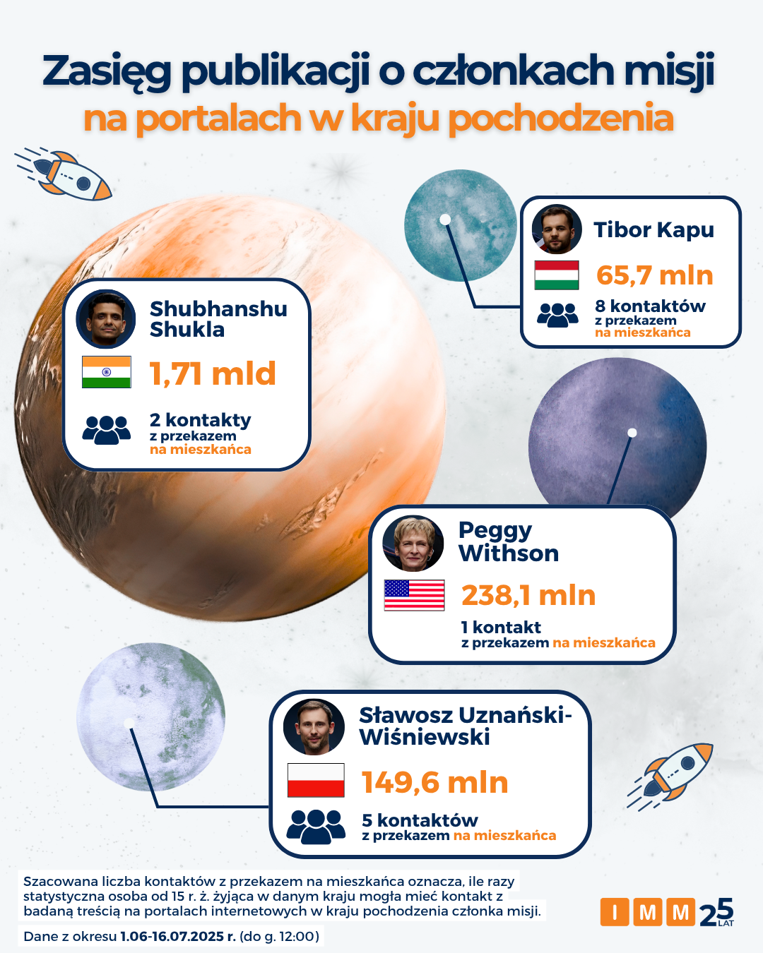Temat udziału Sławosza Uznańskiego-Wiśniewskiego w misji Ax-4 osiągnął blisko 2 mld zasięgu we wszystkich typach mediów. Oznacza to, że statystyczna osoba w Polsce od 15 r.ż. miała kontakt z tymi treściami średnio 59 razy.
