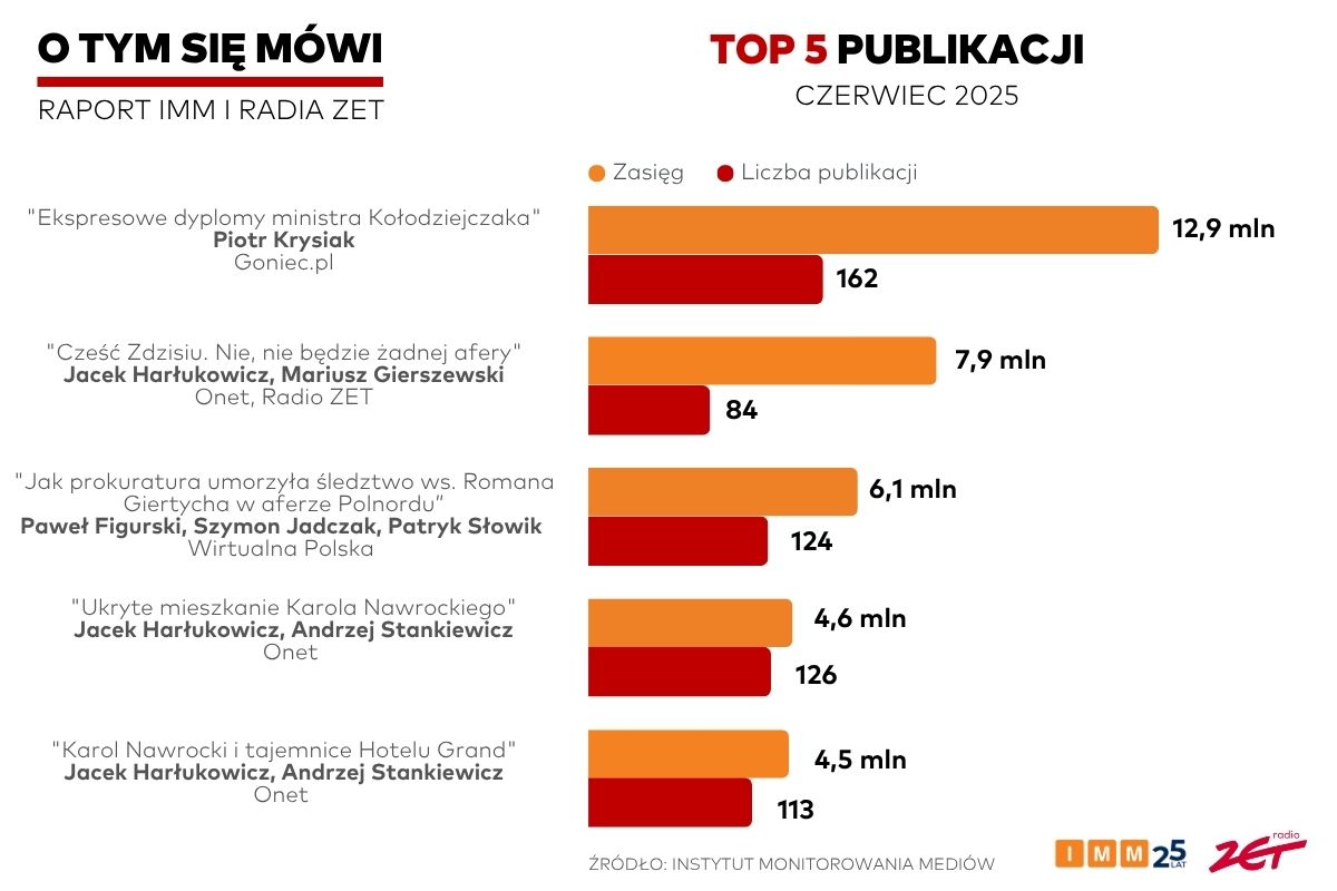 Artykuł Piotra Krysiaka o dyplomach Michała Kołodziejczaka zdominował czerwcowe zestawienie najbardziej zasięgowych publikacji w Polsce. Comiesięczny raport „O tym się mówi” przygotowuje Instytut Monitorowania Mediów we współpracy z Radiem ZET. Powstaje on w ramach projektu Nagroda Radia ZET im. Andrzeja Woyciechowskiego.