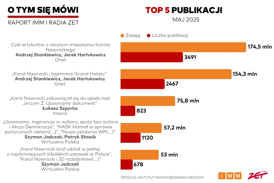 Pierwsze miejsce w majowym zestawieniu przypadło cyklowi artykułów o drugim mieszkaniu Karola Nawrockiego, które można było przeczytać w Onecie. Temat ten na długie tygodnie zdominował dyskurs kampanii prezydenckiej w Polsce. W kolejnych odcinkach śledztwa Jacek Harłukowicz i Andrzej Stankiewicz odsłaniali kulisy przejęcia mieszkania komunalnego należącego do schorowanego Jerzego Ż., które miało być formą zadośćuczynienia za pomoc finansową i opiekę. Łącznie powstały cztery publikacje: „Ukryte mieszkanie Karola Nawrockiego”, „To jego mieszkanie przejął Karol Nawrocki. Znaleźliśmy 80-letniego pana Jerzego”, „Opiekunka pana Jerzego: Nawrocki nie zrobił dla pana Jerzego nic poza przejęciem jego mieszkania. I do tego bezczelnie kłamie, że płacił rachunki”, „Ujawniamy: Kawalerkę pana Jerzego Nawroccy sprzedali sami sobie” (współautorem tego artykułu był również Piotr Olejarczyk). Sprawa wywołała wiele kontrowersji, a sprzeczne wyjaśnienia sztabu wyborczego kandydata na urząd prezydenta tylko podsycały zainteresowanie tematem. Na doniesienia Onetu powoływali się zarówno politycy, jak i inne media. Łącznie w maju powstało na ten temat aż 3491 publikacji, które wygenerowały zasięg wynoszący 174,5 mln kontaktów z przekazem. Jak podkreślają autorzy zestawienia, to absolutny rekord – odkąd jest przygotowywany raport „O tym się mówi” żadnej redakcji nie udało się nawet zbliżyć do takiego wyniku.