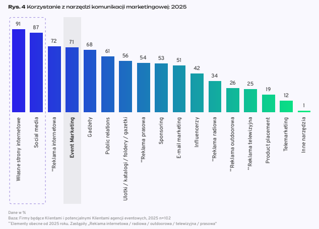 Event marketing pozostaje jednym z filarów komunikacji. Obecnie korzysta z niego 71 proc. firm. Narzędzie to zajmuje czwarte miejsce pod względem popularności. Ustępuje jedynie własnym stronom internetowym, social mediom i reklamie internetowej.