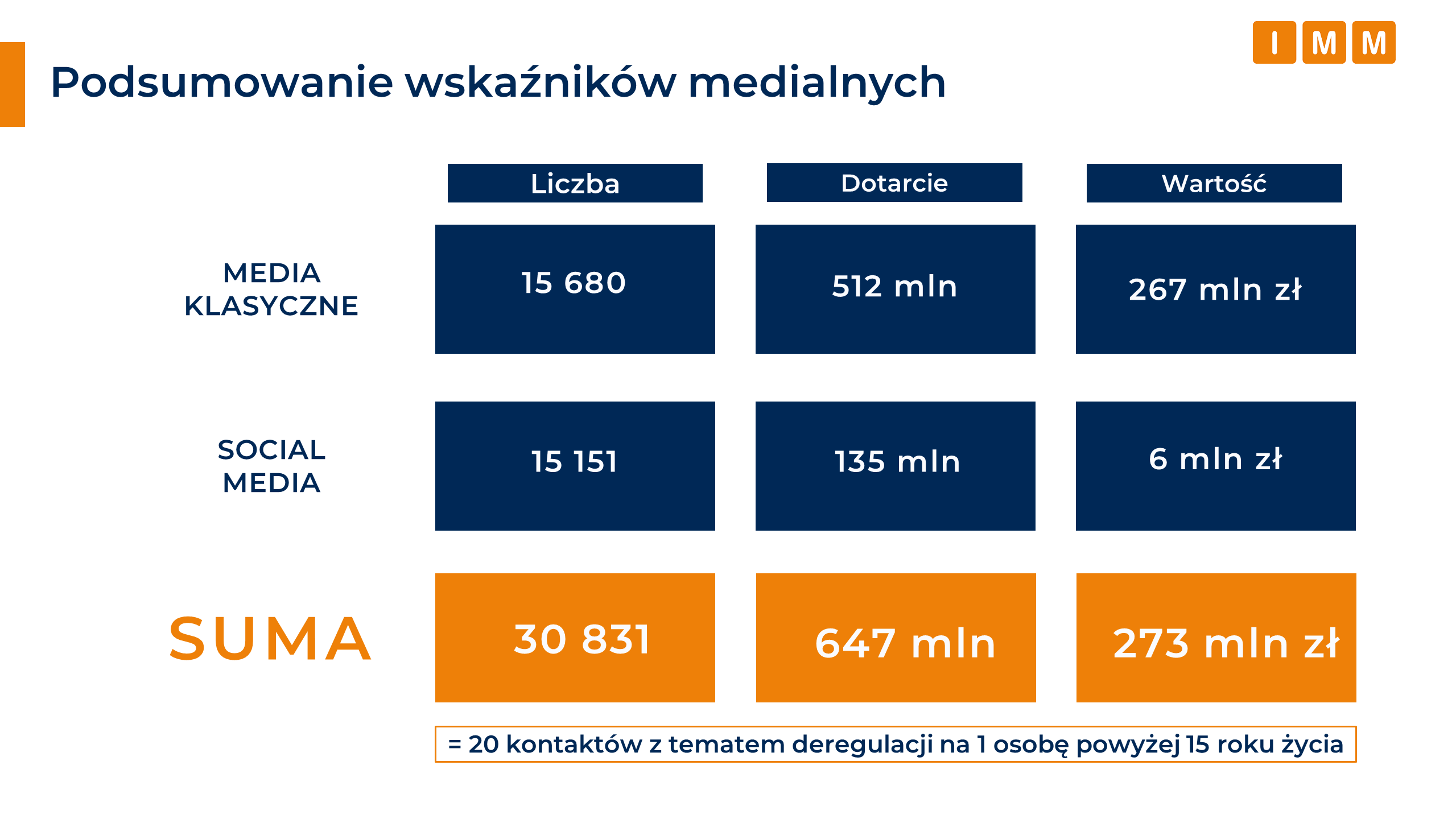 Zasięg informacji o Orlenie okazał się niższy (pomimo większej liczby publikacji), ponieważ temat deregulacji był szeroko komentowany w opiniotwórczych mediach głównego nurtu. Deregulacja wygrała także z Robertem Lewandowskim pod względem wartości reklamowej oraz samej liczby publikacji. Analiza pokazuje, że temat deregulacji w gospodarce stał się jednym z wiodących w dyskursie medialnym.