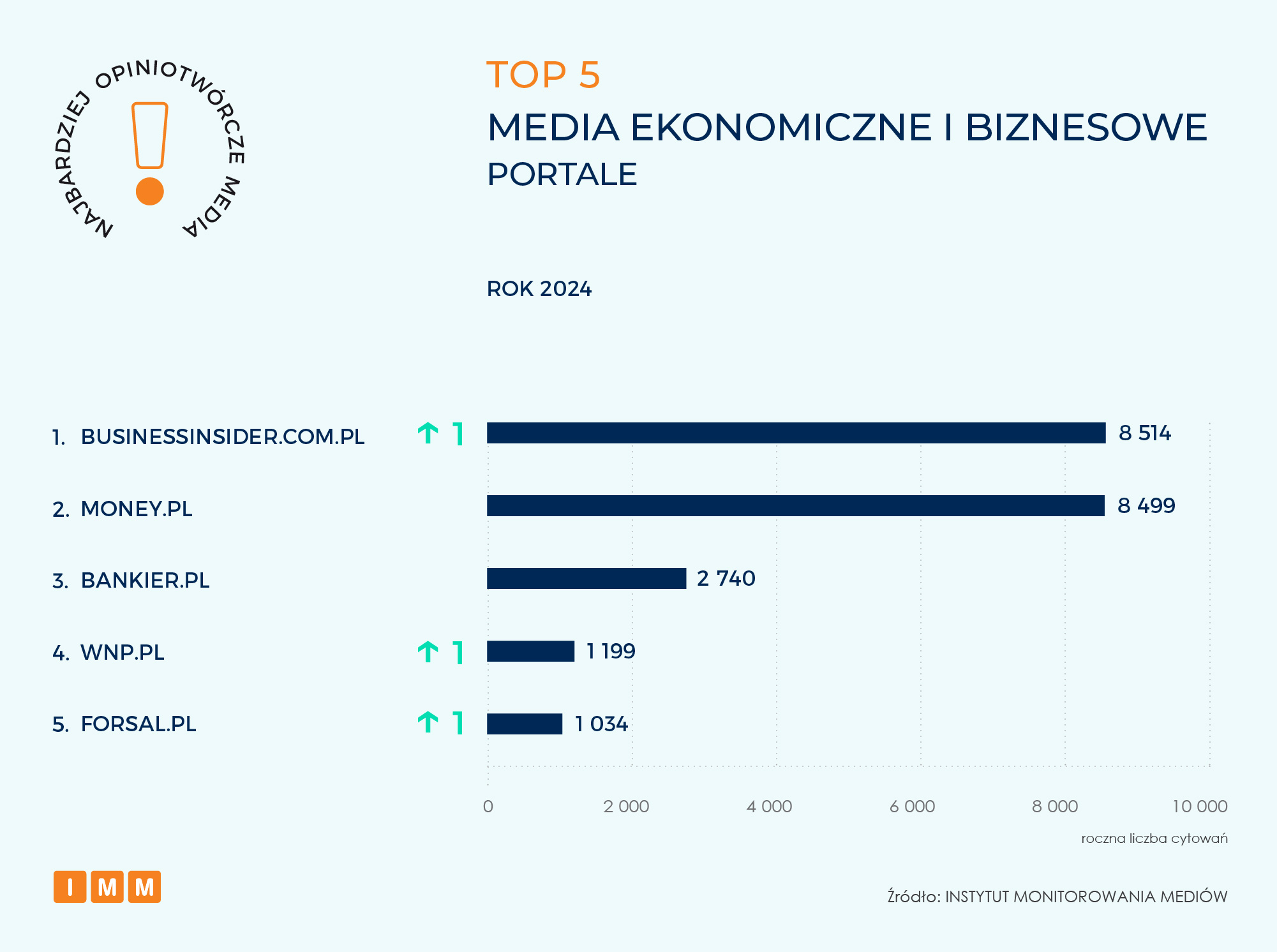 Z kolei ranking najbardziej opiniotwórczych portali ekonomicznych i biznesowych otwiera Business Insider z wynikiem ponad 8,5 tys. powołań. Drugie miejsce należy do Money z wynikiem prawie 8,5 tys. cytowań, m.in ze względu na artykuł dotyczący ogromnej podwyżce dla prezesa Glapińskiego. Podium zamyka Bankier, do informacji którego dziennikarze odwoływali się ponad 2,7 tys. razy. Na 4 miejscu z liczbą 1,2 tys. cytowań znajdziemy WNP, a zestawienie zamyka Forsal – 1 tys. wzmianek.