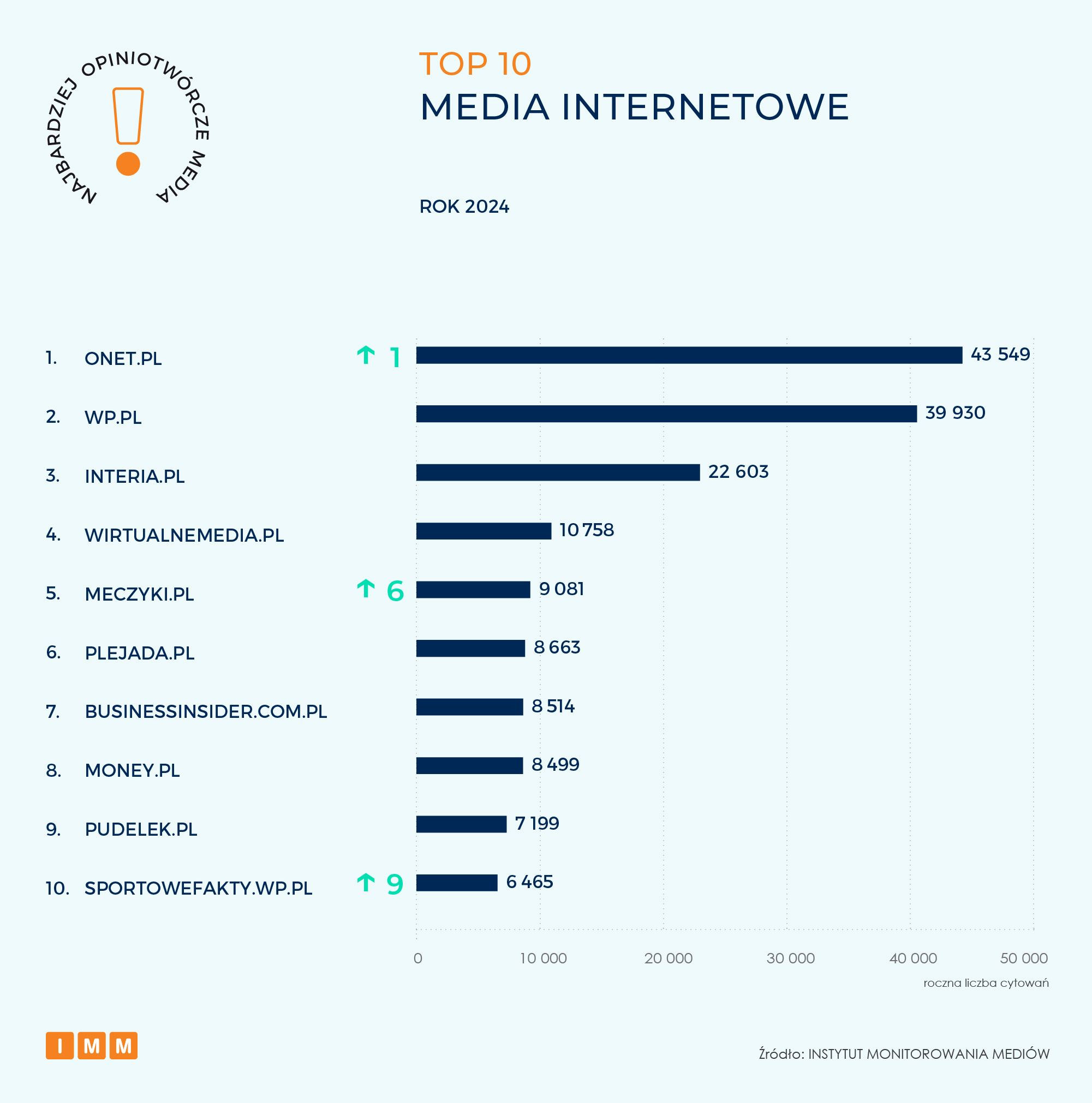 Na czele kategorii portali utrzymuje się Onet, do którego informacji odwoływano się ponad 43,5 tys. razy. Z liczbą 39,9 tys. wzmianek miejsce drugie zajął zeszłoroczny lider – Wirtualna Polska. Portal w październiku odnotował skok w liczbie wzmianek m.in. dzięki artykułowi Szymona Jadczaka. Według ustaleń byłego dziennikarza, wiceminister rozwoju i technologii Jacek Tomczak przez lata współpracował z branżą deweloperską poprzez swoją kancelarię notarialną. Podium zamyka Interia wzmiankowana przez inne tytuły mediowe 22,6 tys. razy. Awans aż o sześć miejsc w stosunku do roku 2023 odnotował portal Meczyki.pl z liczbą niemal 9,1 tys. wzmianek oraz o 9 miejsc wzwyż Sportowe Fakty z liczbą prawie 6,5 tys. odwołań.