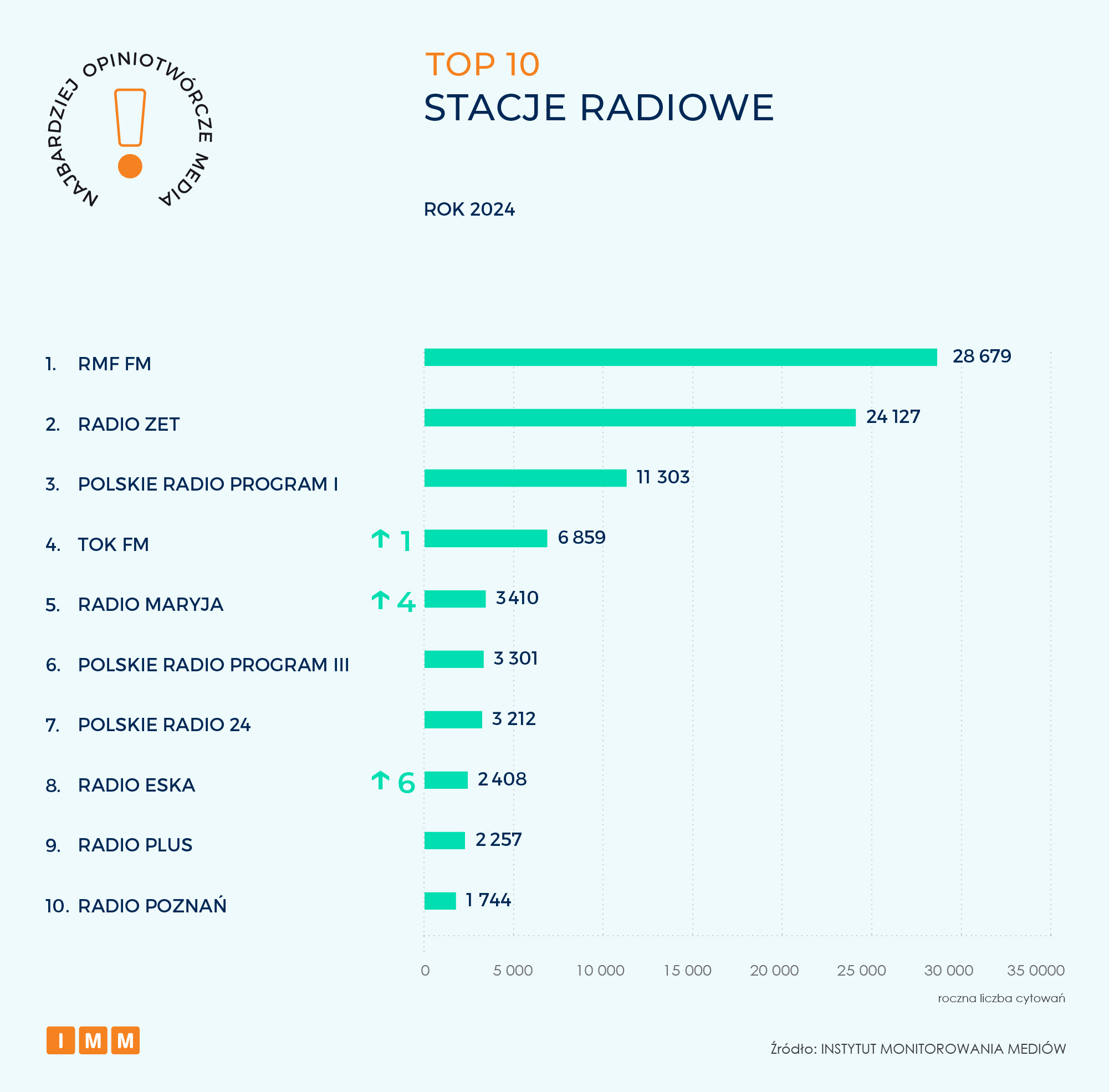 Najbardziej opiniotwórczą stacją radiową w kraju pozostaje RMF FM, na którą w 2024 roku dziennikarze innych redakcji powoływali się ponad 28,6 tys. razy. Na drugim miejscu znalazło się Radio ZET z wynikiem przeszło 24 tys. cytowań. Rozgłośnia jako pierwsza poinformowała o tym, że funkcjonariusze Centralnego Biura Antykorupcyjnego prowadzą czynności procesowe w spółce Orlen. Podium zamyka Program I Polskiego Radia z liczbą 11,3 tys. odnotowań. W porównaniu z rokiem 2023, Radio Maryja awansowało o 4 pozycje, z liczbą 3,4 tys. wzmianek oraz Radio Eska aż o 6 pozycji z 2,4 tys. odnotowań.