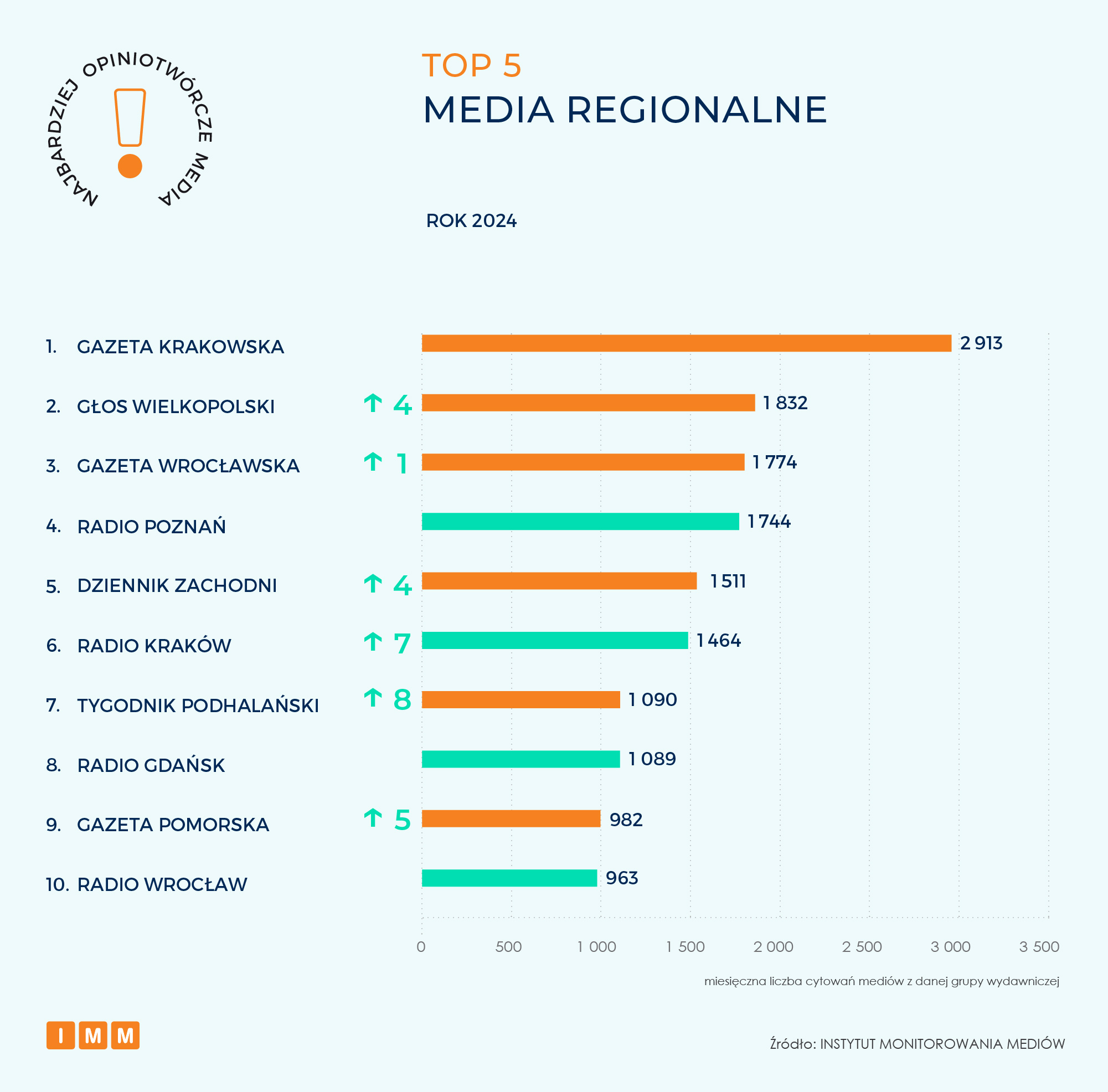 Pierwsze miejsce w kategorii najbardziej opiniotwórczych mediów regionalnych zajmuje „Gazeta Krakowska”, której materiały cytowano w innych mediach 2,9 tys. razy. Media powoływały się m.in. na rozmowę z Adamem Klęczarem, prezesem firmy Aksam produkującej Paluszki Beskidzkie. W lipcu spłonęła fabryka należąca do producenta, a prezes firmy zapewnił, że nikt z załogi na tym nie ucierpi i nie będzie zwolnień. Drugie miejsce w rankingu należy do „Głosu Wielkopolskiego”, który awansował aż o cztery miejsca w porównaniu do ubiegłego roku i odnotował ponad 1,8 tys. wzmianek. Podium zamyka „Gazeta Wrocławska” z liczbą niemal 1,8 tys. cytowań i awansem o jedną pozycję. Na czwartym miejscu znajduje się Radio Poznań z wynikiem przeszło 1,7 tys. cytowań, a tuż za nim –„Dziennik Zachodni” z wynikiem 1,5 tys. wzmianek. Duży wzrost (o siedem miejsc) odnotowało Radio Kraków, które uzyskało niemal 1,5 tys. powołań, a za nim znalazł się „Tygodnik Podhalański” z awansem aż o 8 miejsc (1,1 tys. cytowań). Na miejscach 8-10 znalazły się natomiast kolejno Radio Gdańsk (ponad 1 tys. powołań), „Gazeta Pomorska” (982 cytowania) i Radio Wrocław (963 odwołania).