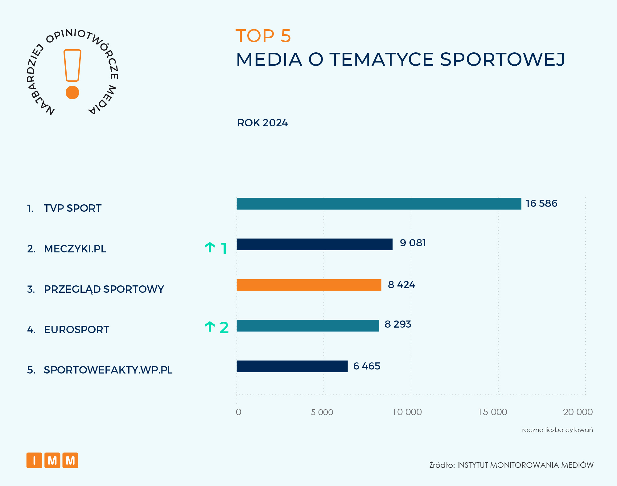TVP Sport znajduje się na czołowej pozycji wśród najbardziej opiniotwórczych mediów sportowych z liczbą 16,6 tys. powołań. Na kolejnej pozycji uplasował się portal Meczyki.pl, na który powoływano się ponad 9 tys. razy. Ostatnie miejsce podium należy do „Przeglądu Sportowego” – przeszło 8,4 tys. cytowań. W czołowej piątce znalazły się jeszcze Eurosport (niespełna 8,3 tys. wzmianek) i Sportowe Fakty (blisko 6,5 tys. odwołań).