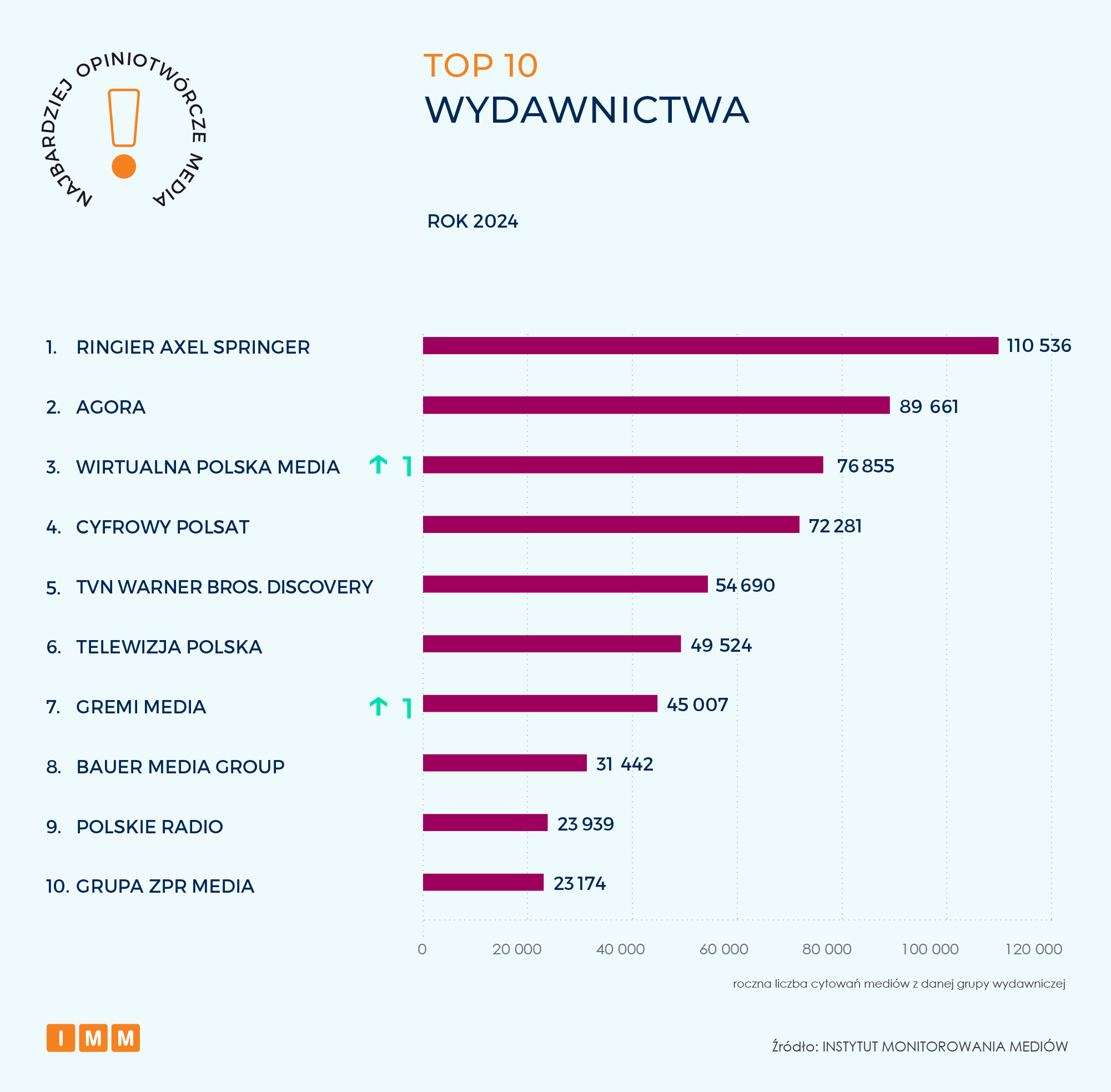 Pierwsze miejsce wśród najbardziej opiniotwórczych wydawnictw ubiegłego roku utrzymuje Ringier Axel Springer Polska, którego redakcje Business Insider, „Fakt”, „Forbes”, „Newsweek”, Noizz, Onet, Plejada i „Przegląd Sportowy” były cytowane przez dziennikarzy innych mediów w Polsce ponad 110,5 tys. razy. Na drugim miejscu znajduje się grupa Agora z łącznym wynikiem blisko 89,7 tys. wzmianek badanych tytułów: „Gazeta Wyborcza”, Sport.pl, Radio Plus, Plotek.pl, TOK FM, Gazeta.pl i Radio ZET. Podium zamyka Wirtualna Polska Media reprezentowana przez wp.pl, wirtualnemedia.pl, money.pl, pudelek.pl, Sportowe Fakty, o2.pl, abczdrowie.pl, autokult.pl, dobreprogramy.pl, gadzetomania.pl, fotoblogia.pl do których dziennikarze w Polsce odwoływali się łącznie prawie 76,9 tys. razy.